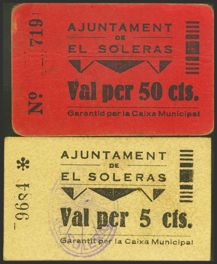 EL SOLERAS (LERIDA). 5 Céntimos y 50 Céntimos. (1937ca). (González: 10022, 10024). El 50 cts raro. EBC-.