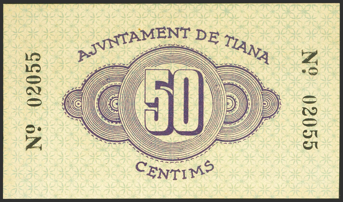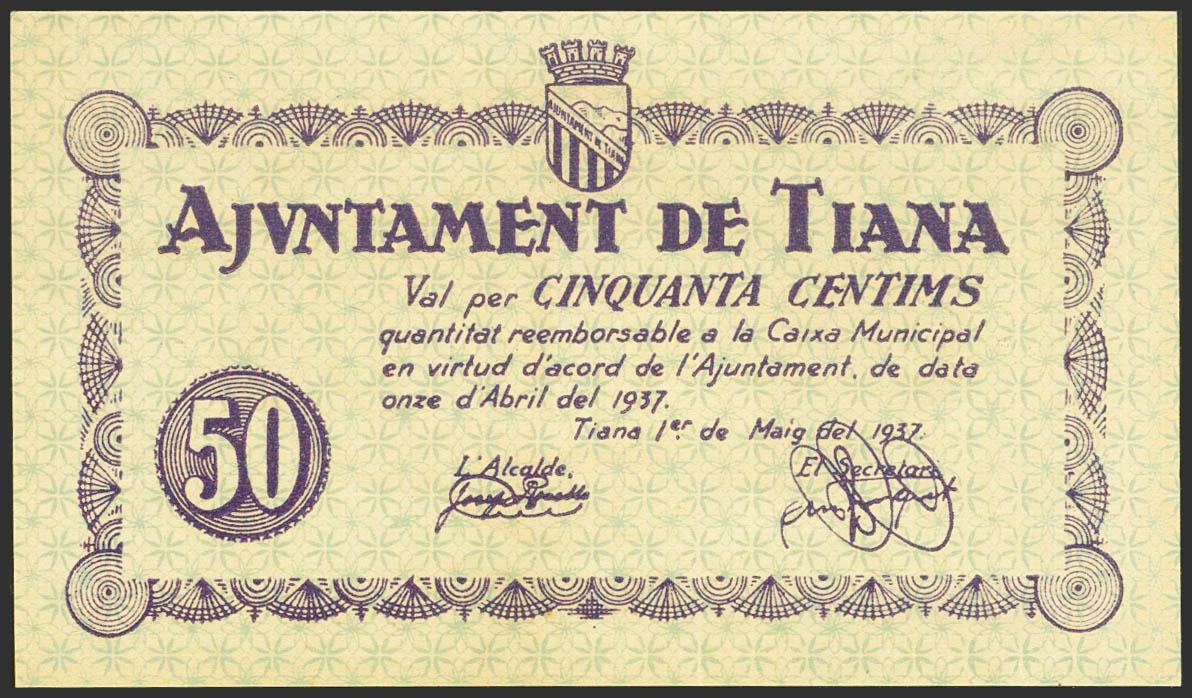 TIANA (BARCELONA). 50 Céntimos. 1 de Mayo de 1937. (González: 10258). Raro, especialmente en esta excepcional calidad. SC-.