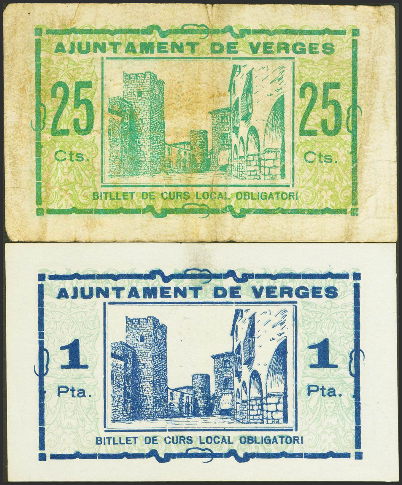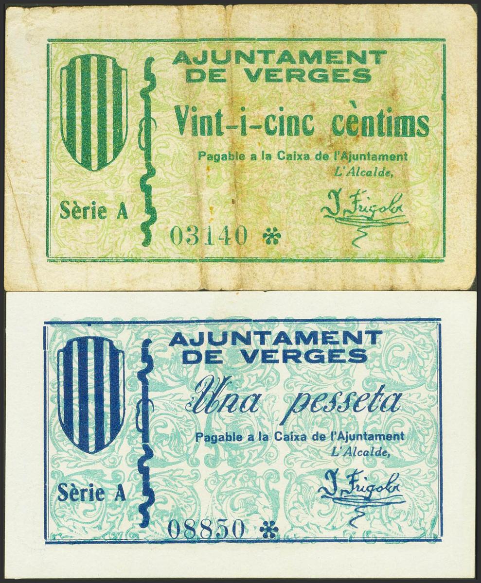 VERGES (LERIDA). 25 Céntimos y 1 Peseta. (1937ca). Serie A, ambos. (González: 10624, 10626). MBC.