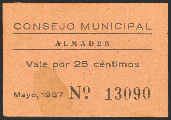 ALMADEN (CIUDAD REAL). 25 Céntimos. Mayo de 1937. (González: 533). RarÃsimo. EBC+++.