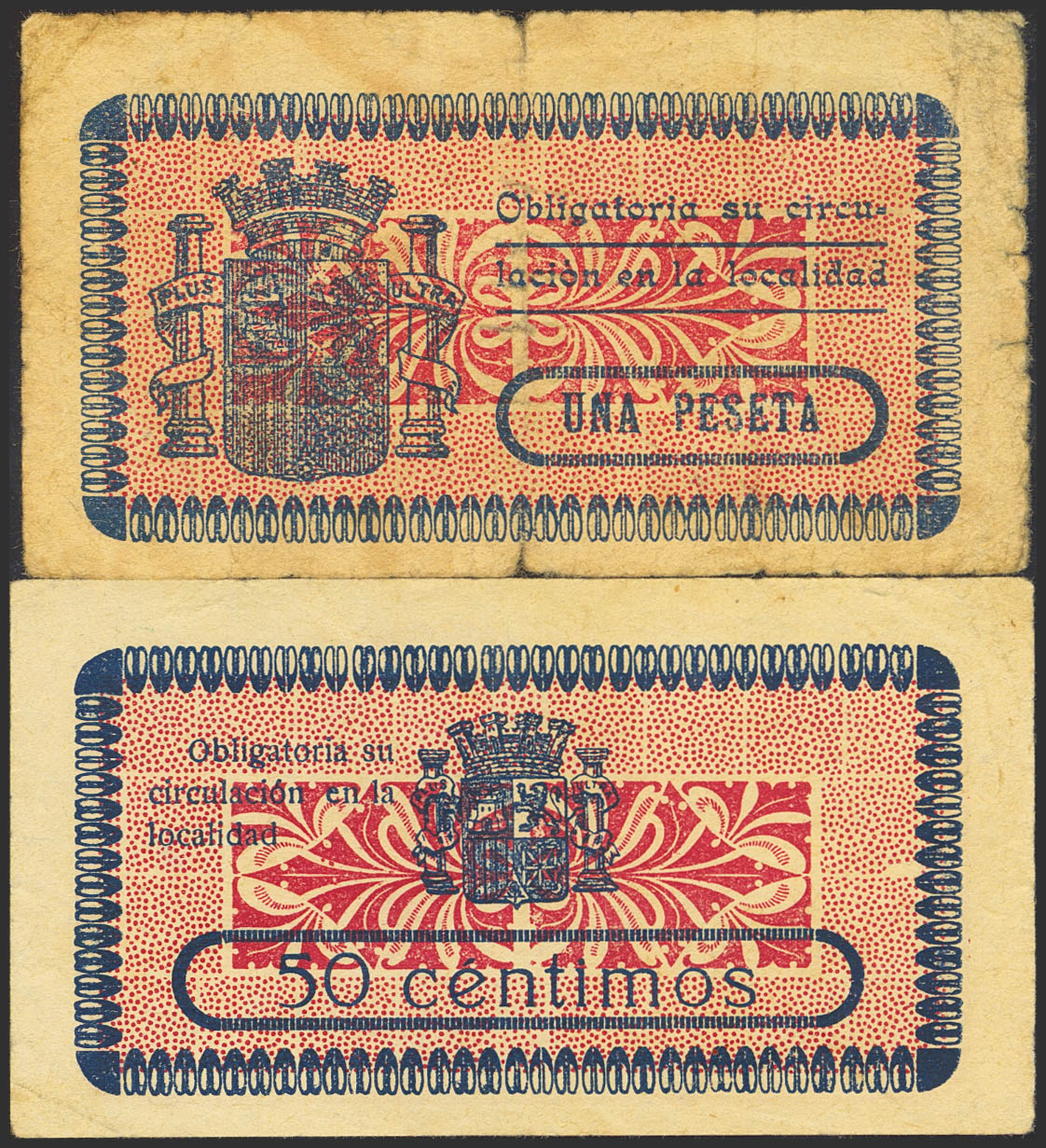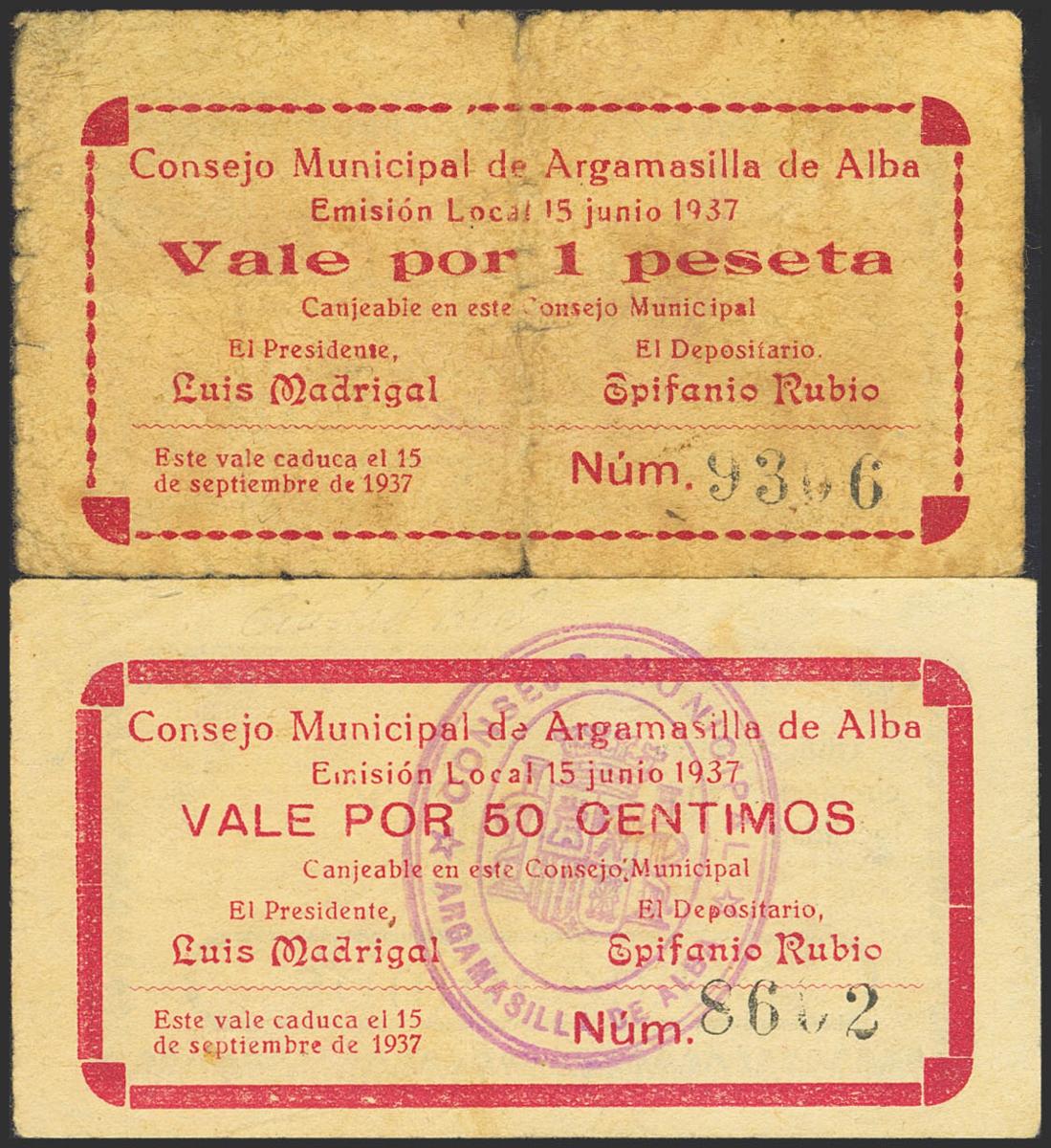 ARGAMASILLA DE ALBA (CIUDAD REAL). 50 Céntimos y 1 Peseta. 15 de Junio de 1937. (González: 766, 768). Raros. BC/MBC+.