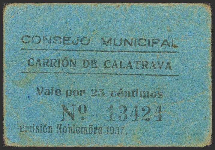 CARRION DE CALATRAVA (CIUDAD REAL). 25 Céntimos. Noviembre de 1937. (González: 1679). Raro. MBC.