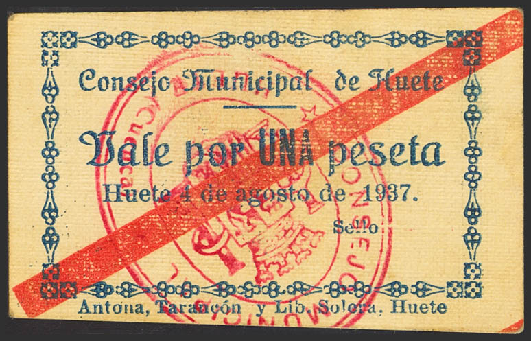 HUETE (CUENCA). 1 Peseta. 4 de Agosto de 1937. (González: 2907). Rarísimo, especialmente en esta calidad. SC-.