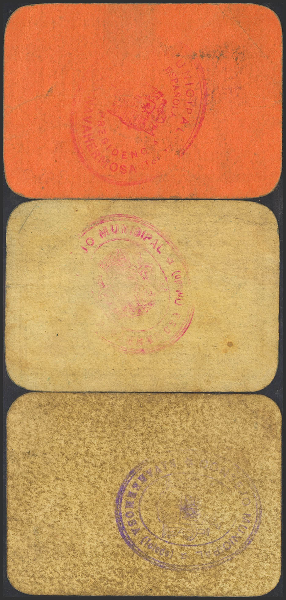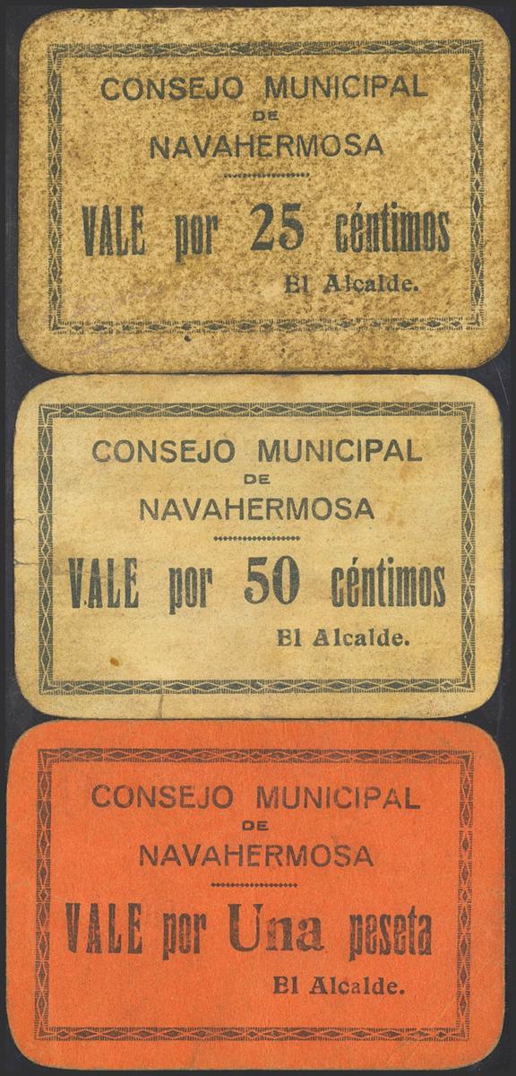 NAVAHERMOSA (TOLEDO). 25 Céntimos, 50 Céntimos y 1 peseta. (1937ca). (González: 3806/08). Rarísima serie completa. MBC/MBC+.