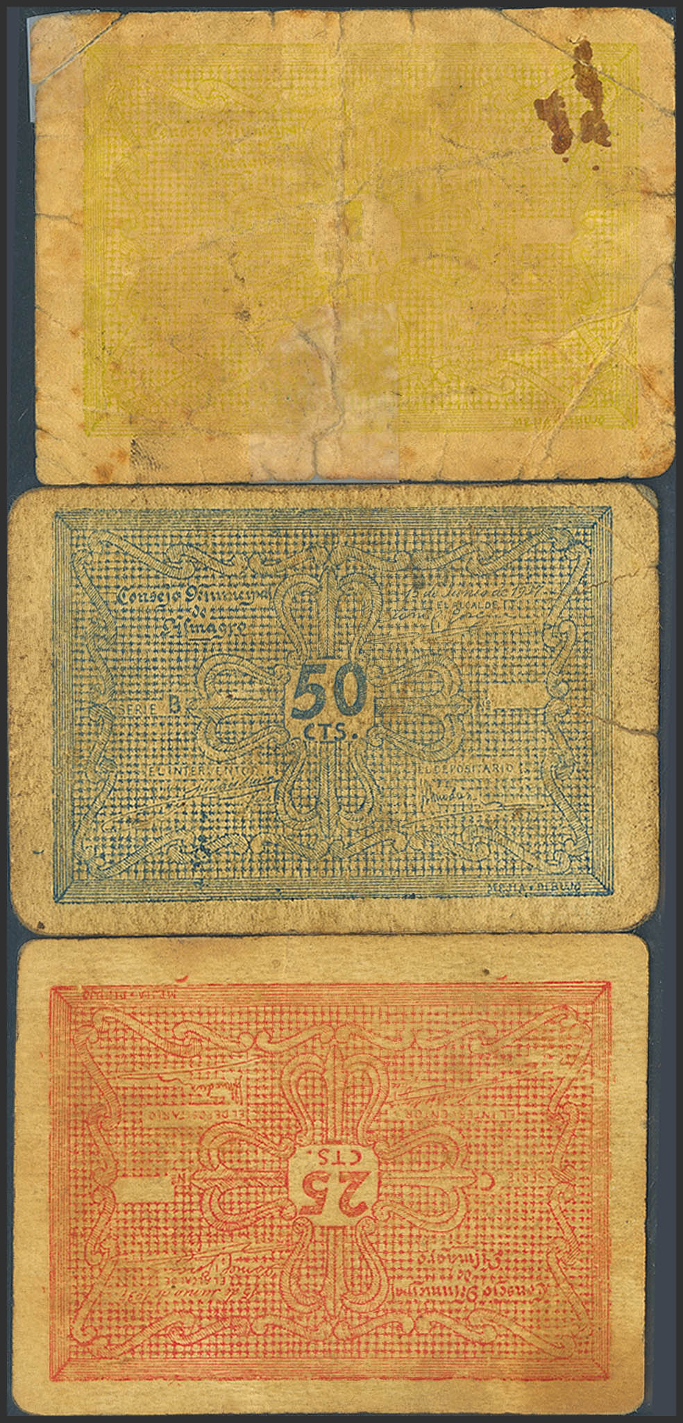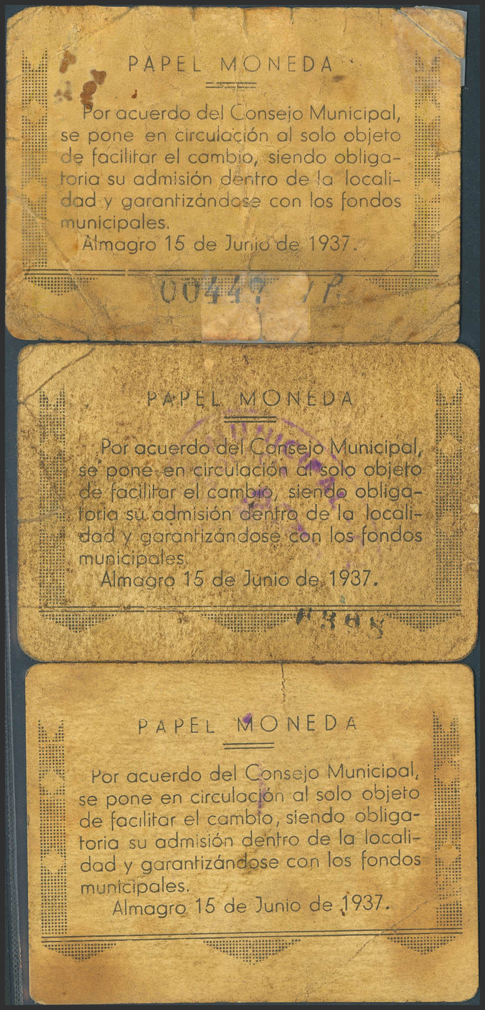 ALMAGRO (CIUDAD REAL). 25 Céntimos, 50 Céntimos y 1 Peseta. 15 de Junio de 1937. Serie C, B y C, respectivamente. (González: 546/58). Inusal serie completa. MBC/RC-.