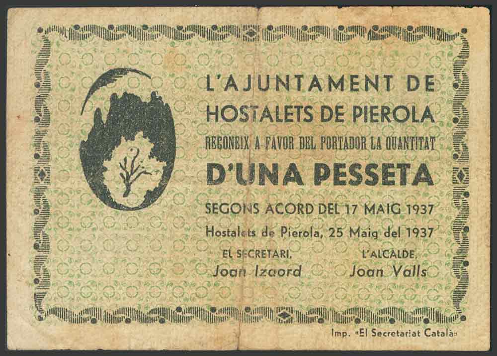 HOSTALETS DE PIEROLA. (BARCELONA). 1 Peseta. 25 de Mayo de 1937. (González: 8230, Montaner: 768C). BC. Escaso.