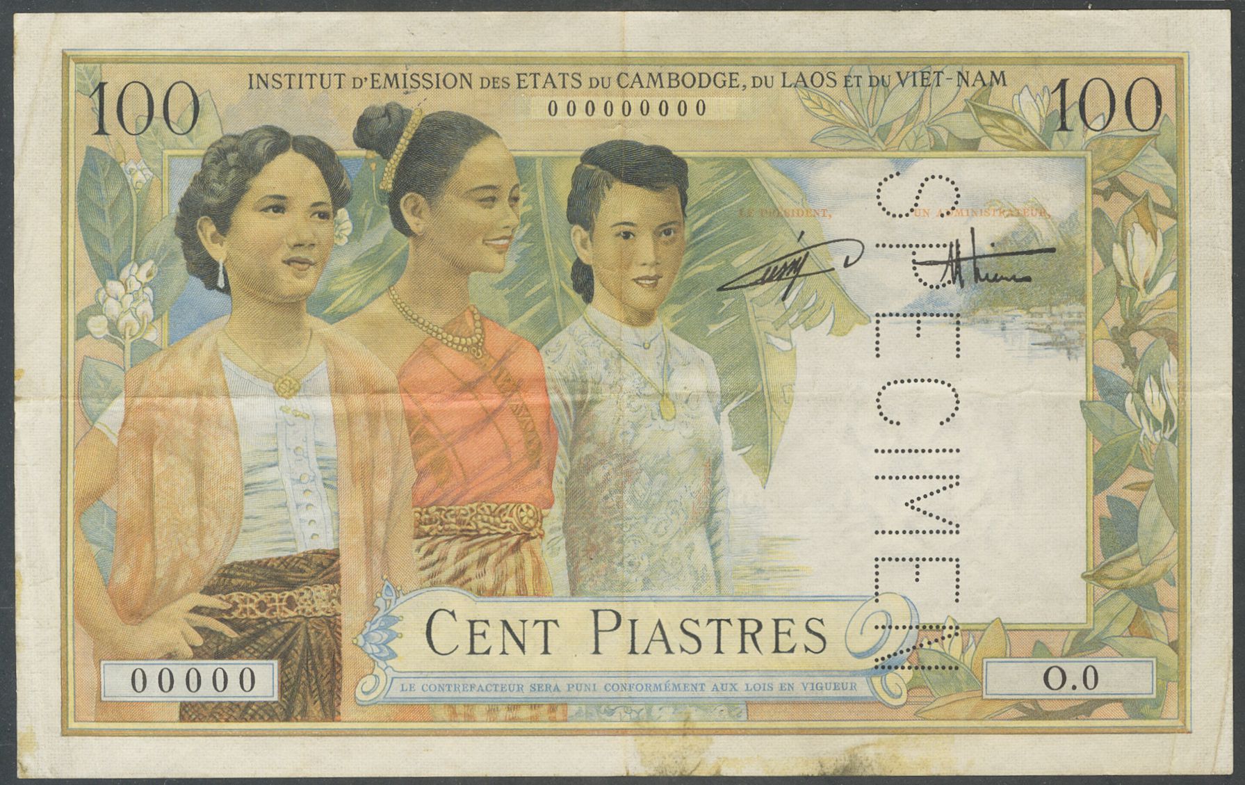 INDOCHINA FRANCESA(FRENCH INDO-CHINA). 100 Piastres. 1954. Specimen y numeración 00000. (Pick: 108). MBC-.