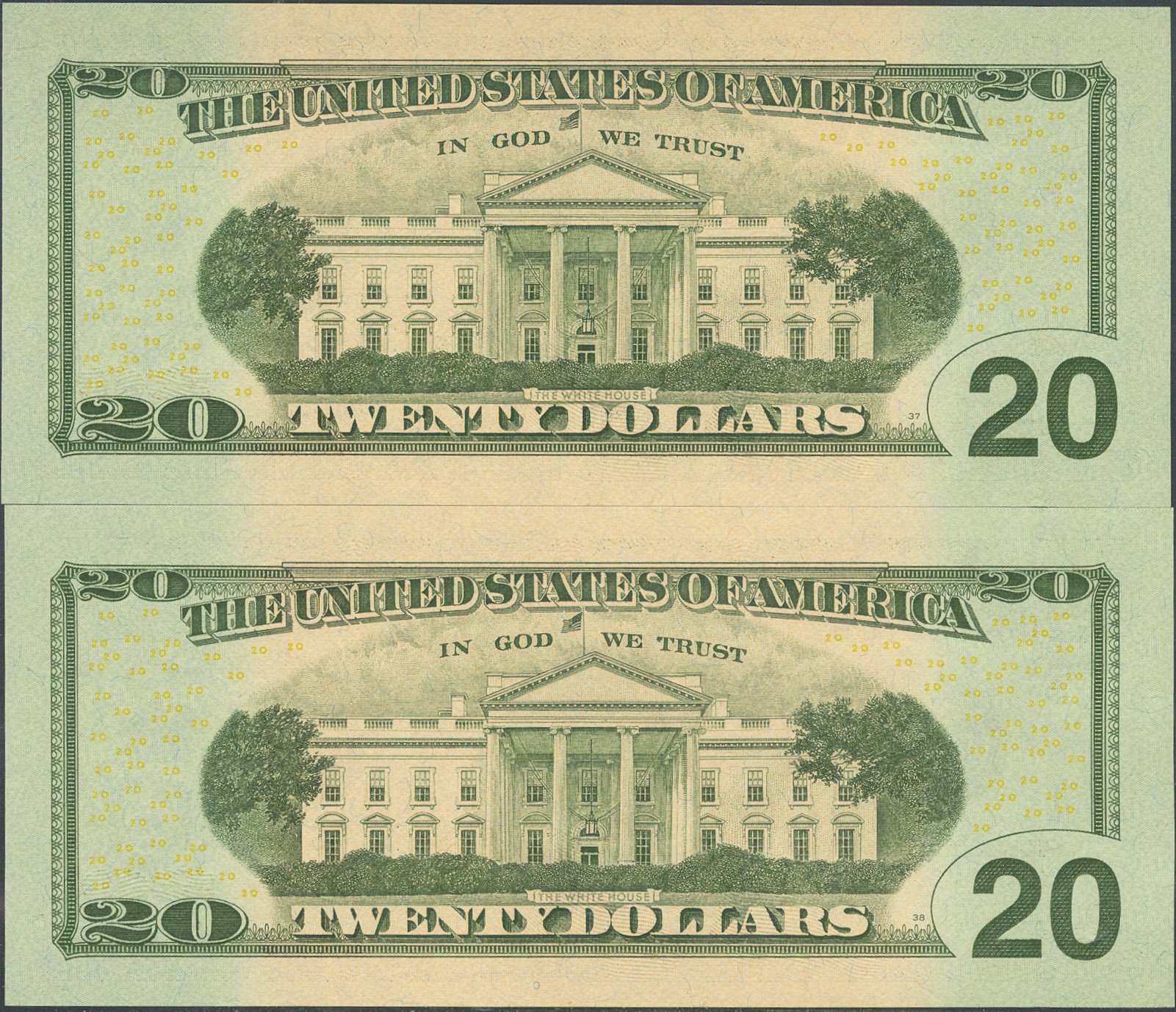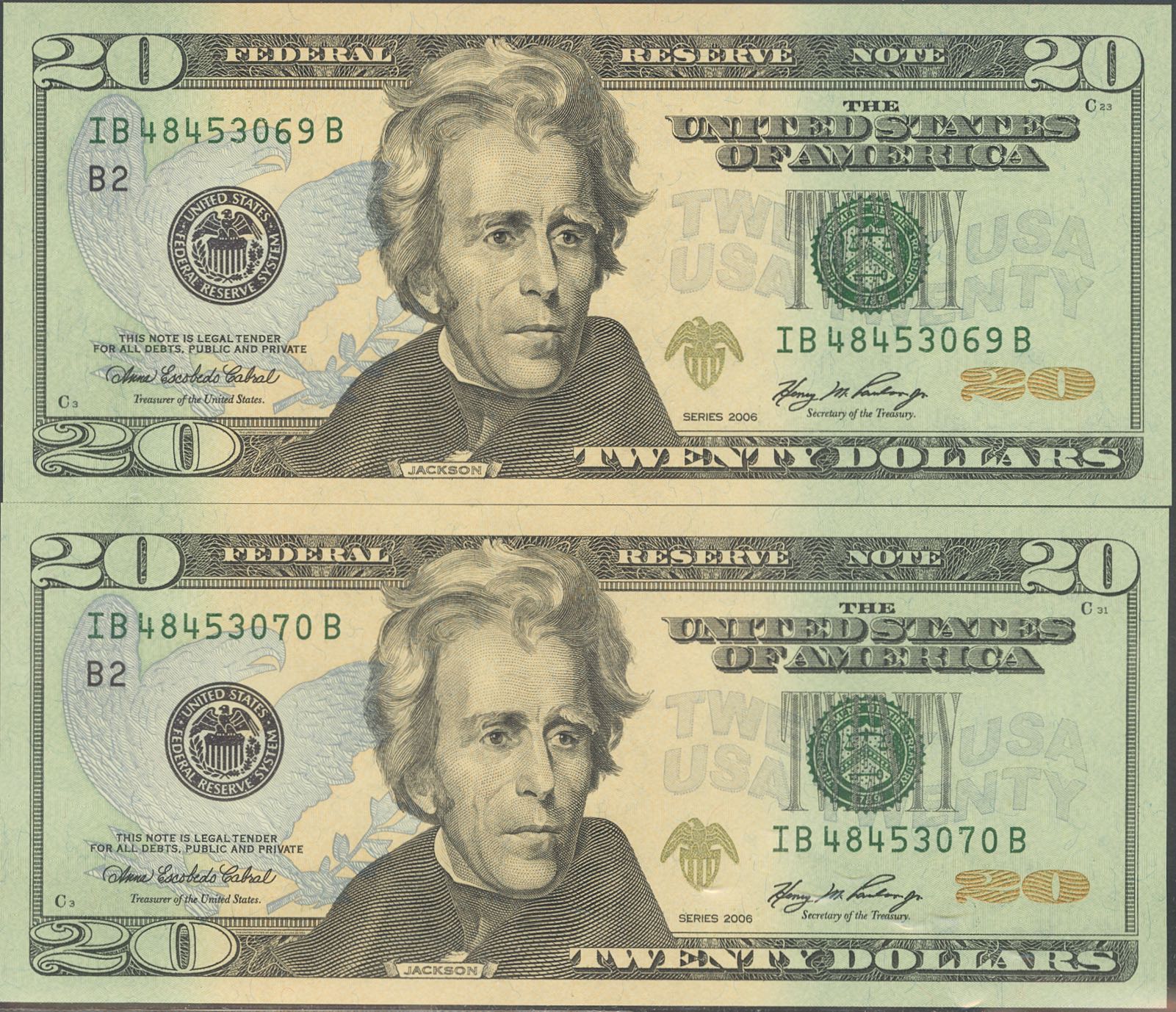 USA. 20 Dollars. Federal Reserve Note. New York. Correlative pair. Serial number IB-B. 2006. (Friedberg: 2093B, Pick: 526). Uncirculated.