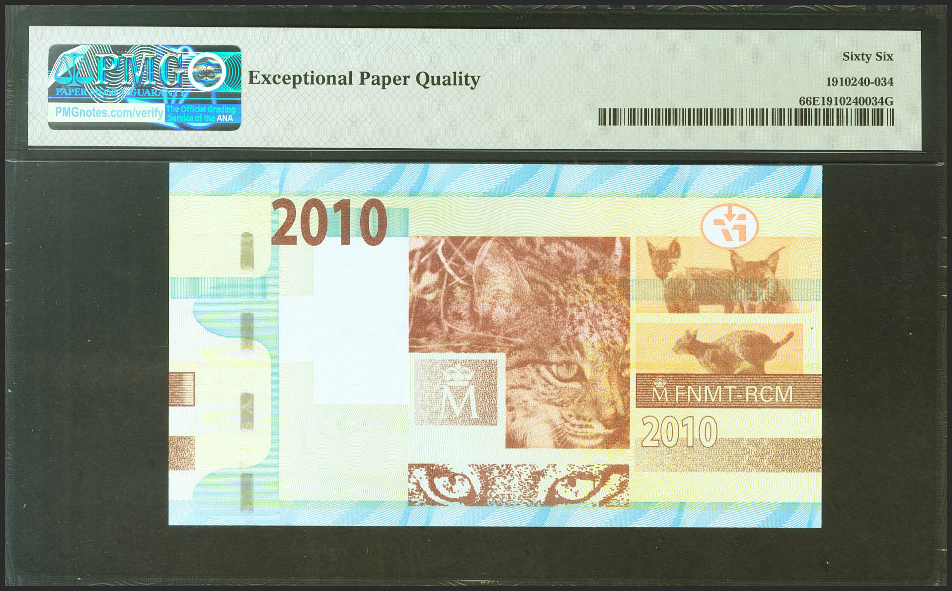 Prueba de billete de la FNMT, emitido en el 2010. No catalogado. Encapsulado PMG66EPQ. SC.