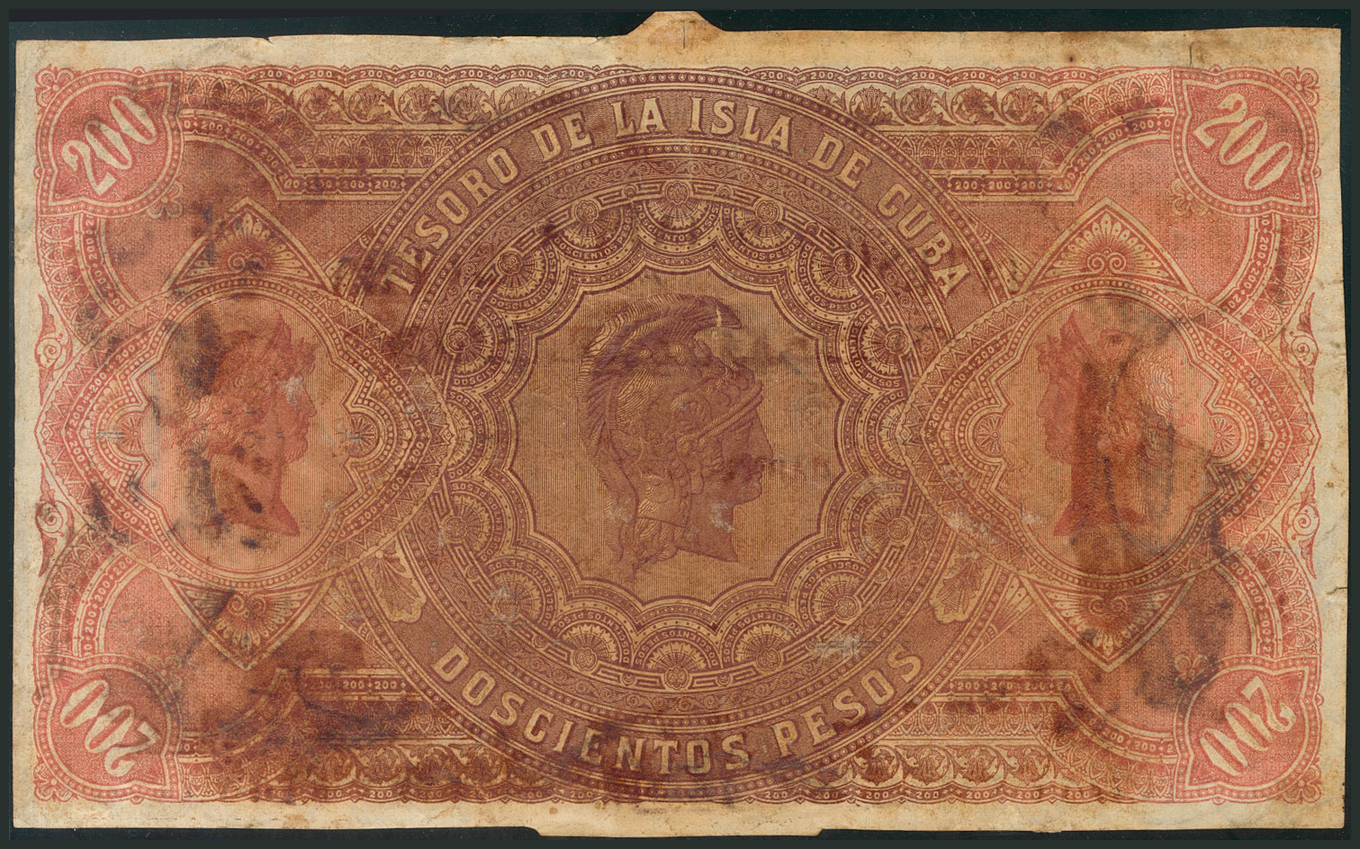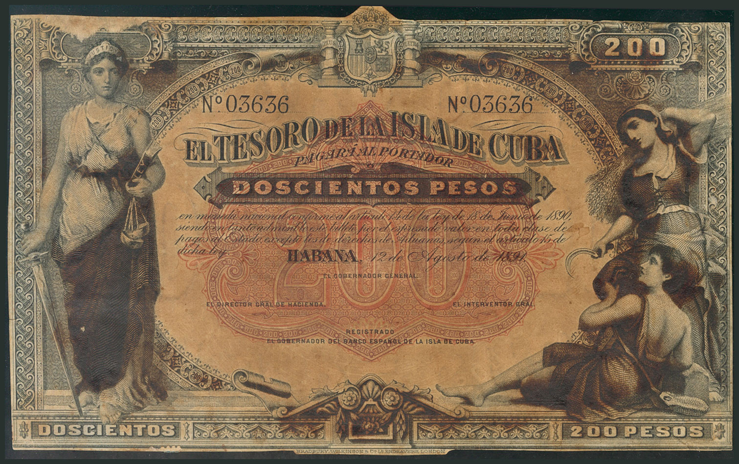 CUBA. 200 Pesos. 12 de Agosto de 1891. (Edifil 2017: 68). Rarísimo, márgenes recortados. MBC-.