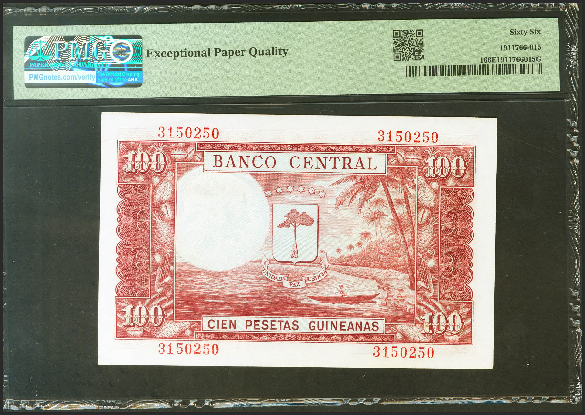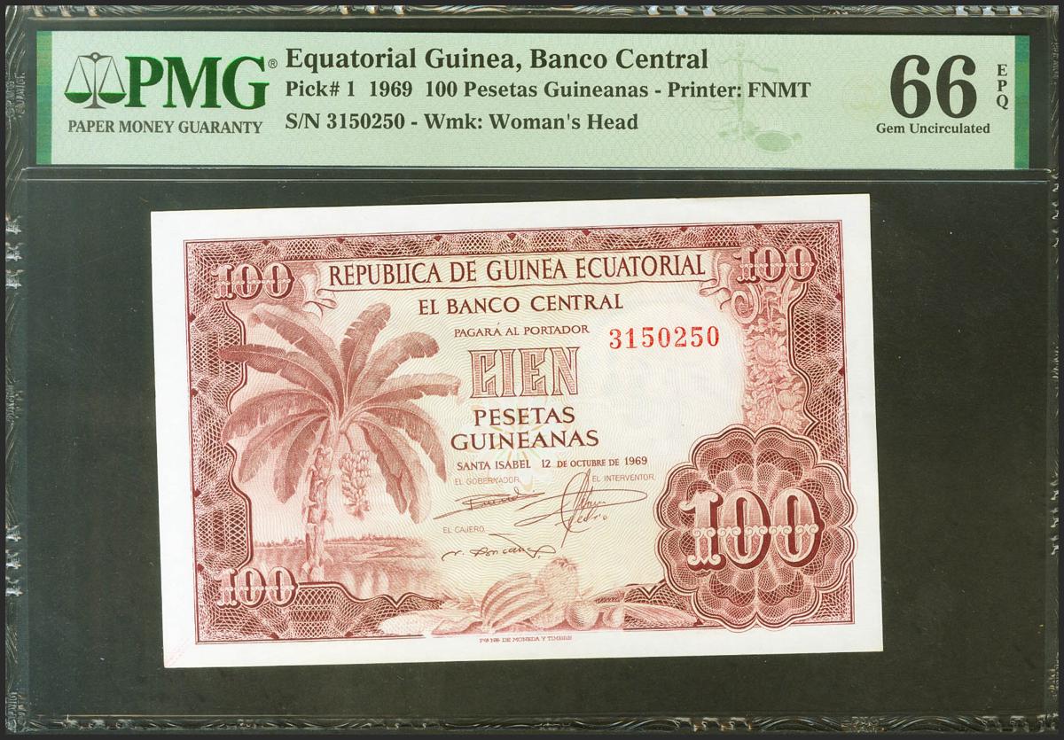 GUINEA ECUATORIAL. 100 Pesetas. 12 de Octubre de 1969. Sin serie. (Pick: 1). Raro en esta excepcional calidad, apresto original. SC. Encapsulado PMG66EPQ.