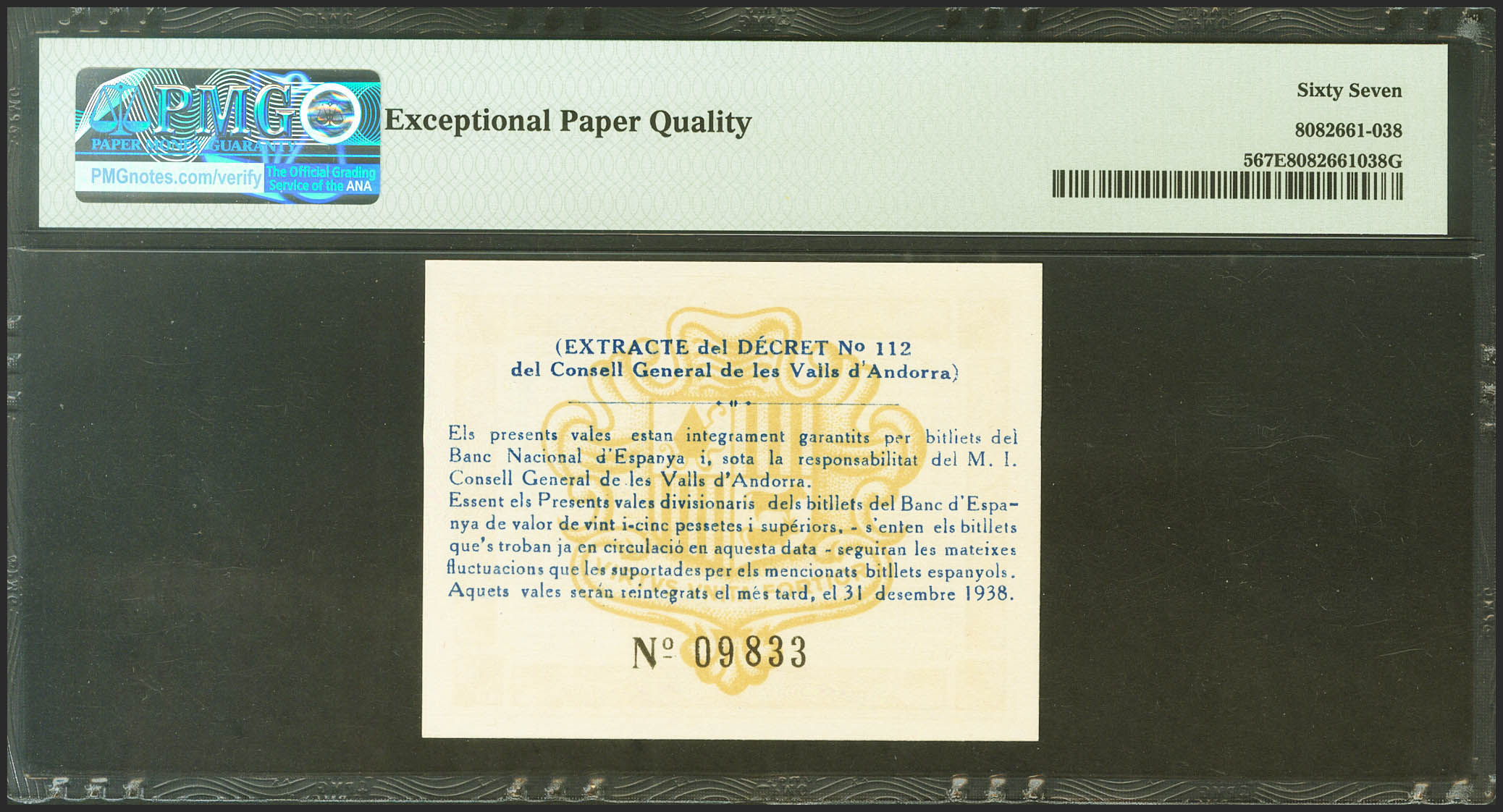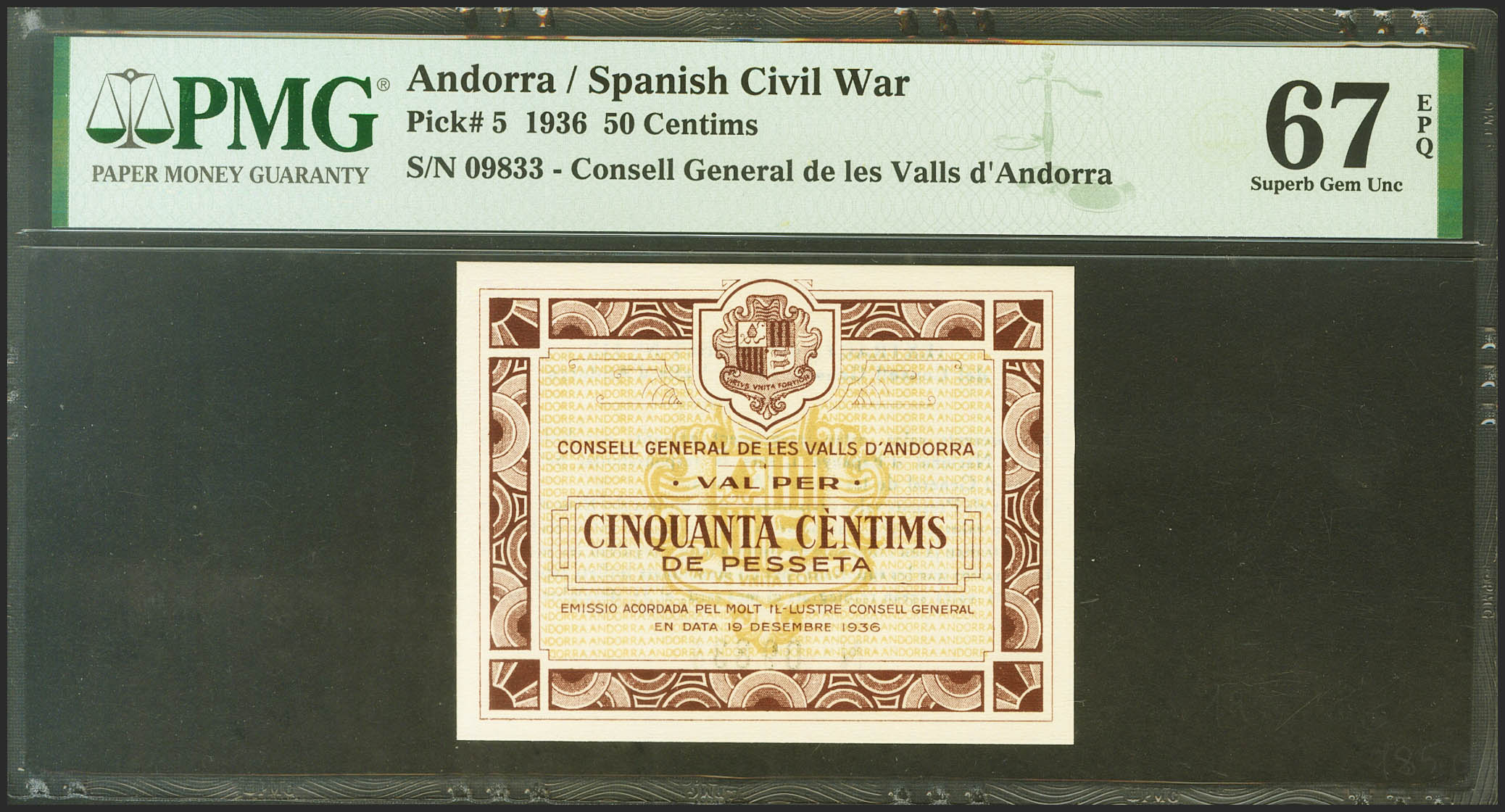 ANDORRA. 50 Centims. 19 de Diciembre de 1936. Sin serie. (Edifil 2021: 1, Pick: 5). Raro en esta excepcional calidad, apresto original. SC. Encapsulado PMG67EPQ. (para hacernos idea de la rareza, a fecha 1 de Marzo de 2023, este billete es el mejor calificado junto a otros doce billetes en PMG)