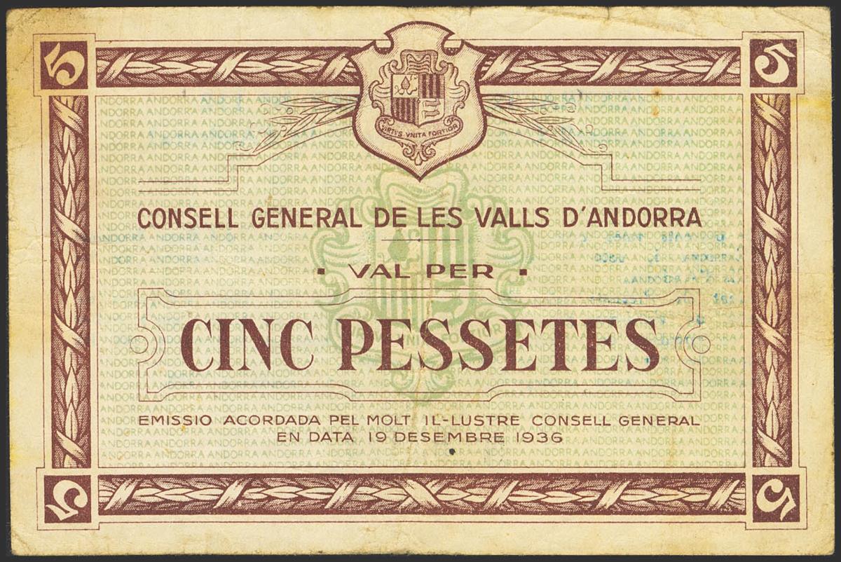 ANDORRA. 5 Pessetes. 19 de Diciembre de 1936. (Edifil 2021: 7, Pick: 8). Raro. MBC.