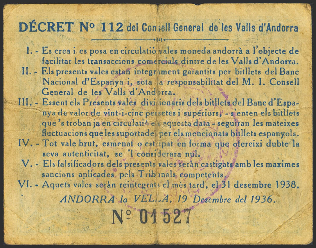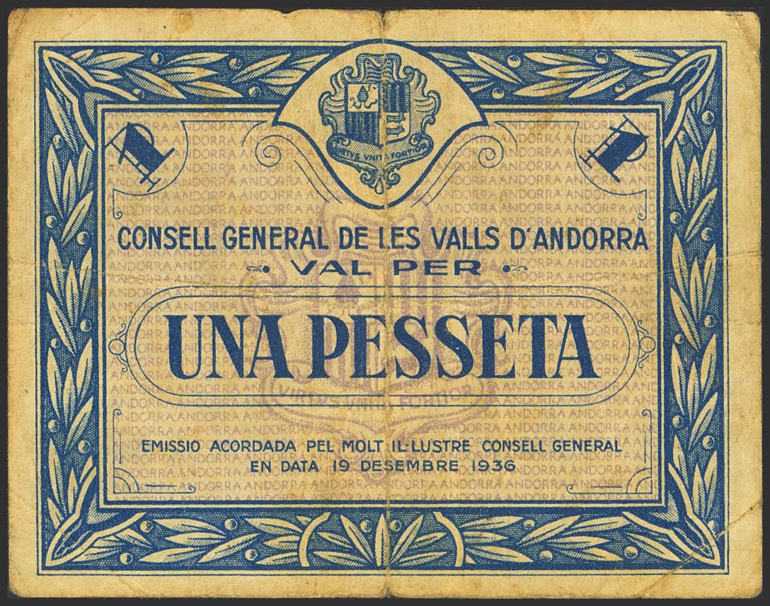 ANDORRA. 1 Pesseta. 19 de Diciembre de 1936. Sin serie. (Edifil 2021: 2, Pick: 1). MBC.