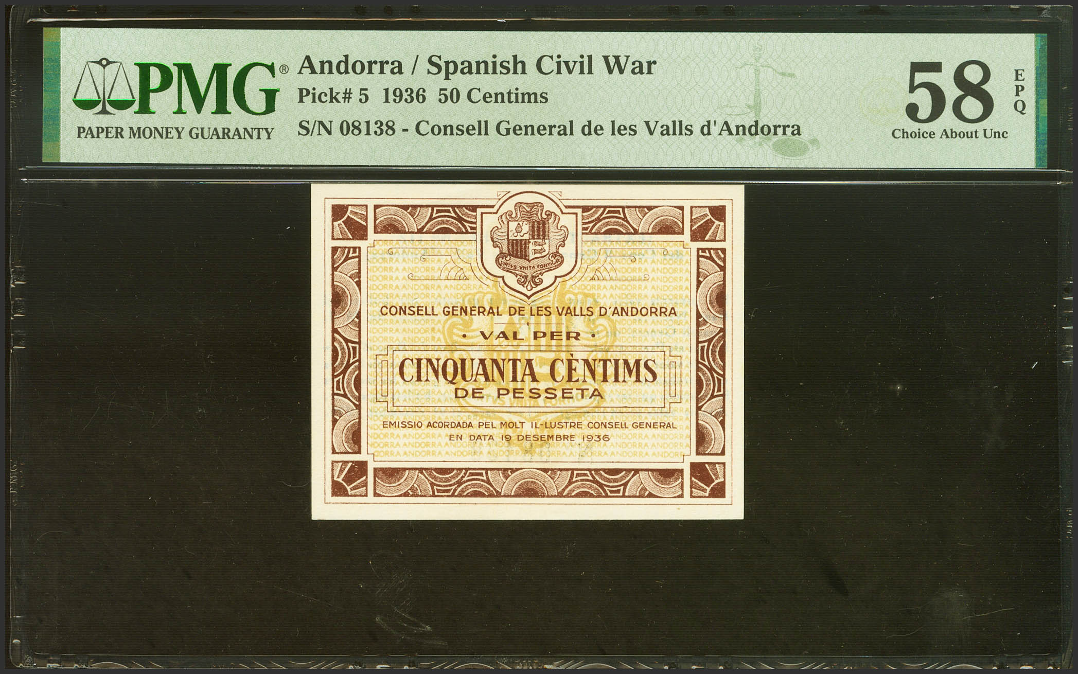 ANDORRA. 50 Centims. 19 de Diciembre de 1936. Sin serie. (Edifil 2021: 1, Pick: 5). Apresto original. SC. Encapsulado PMG58EPQ.