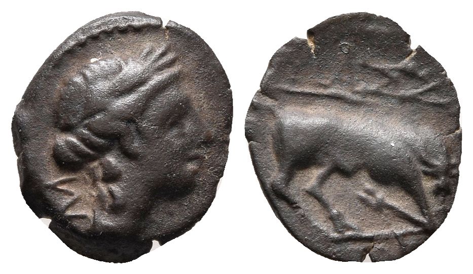 MASSALIA-GALIA. ¿Hemióbolo? 100-170 a.C. Marsella (Francia). A/ Cabeza de Apolo a derecha, detrás M. R/ Toro embistiendo a derecha, MASSA y en exergo SA. LT 1673 var. Ae. 1,42g. MBC+.