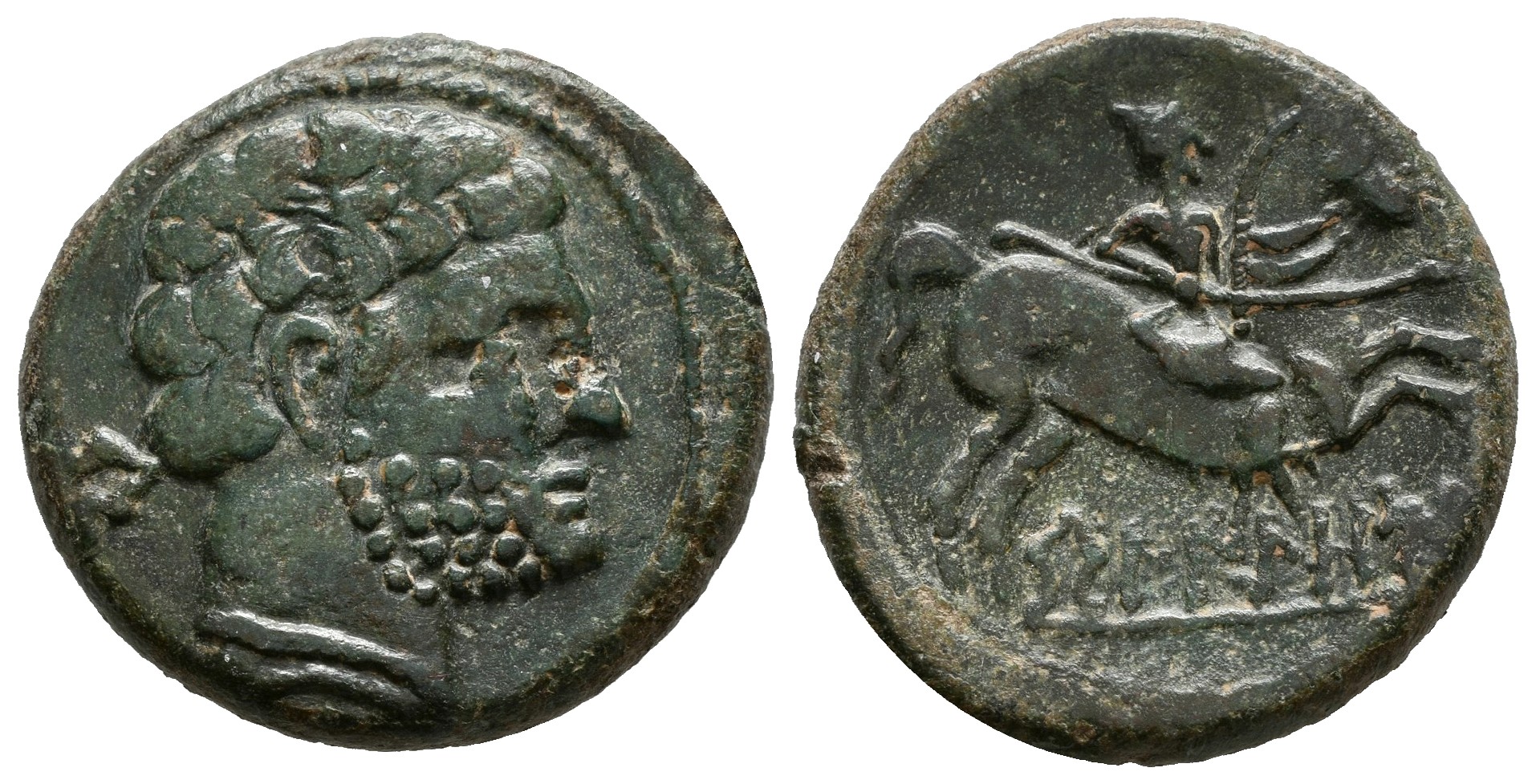 BELIGIOM (Belchite, Zaragoza). As. (Ae. 9,61g/24mm). 120-20 a.C. (FAB-243). Anv: Cabeza barbada a derecha, detrás letra ibérica: Be. Rev: Jinete con lanza a derecha, debajo leyenda sobre lÃnea: BeLIGiOM. MBC+. Pátina verde.
