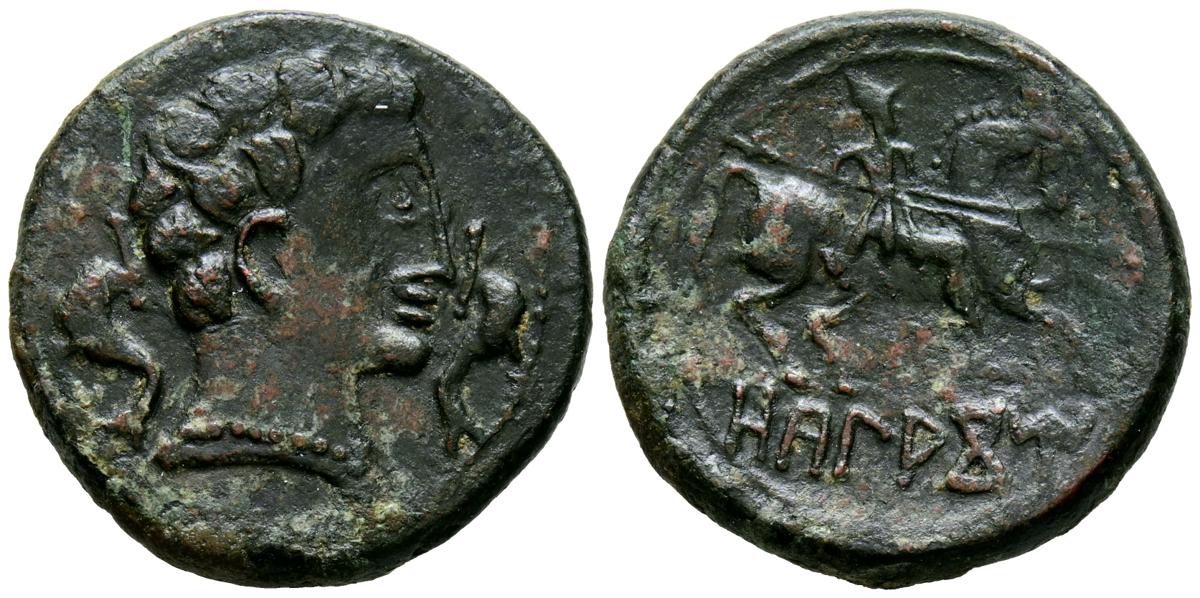 OCALACOM (Posiblemente Oncala, Soria). As. (Ae. 7,67g/23mm). 120-20 a.C. (FAB-1860; ACIP 1864, catalogada como R5). Anv: Cabeza masculina a derecha entre dos delfines. Rev: Jinete con lanza a derecha, debajo leyenda ibérica: OCaLACoM. MBC. Campos repasados. Muy raro ejemplar.