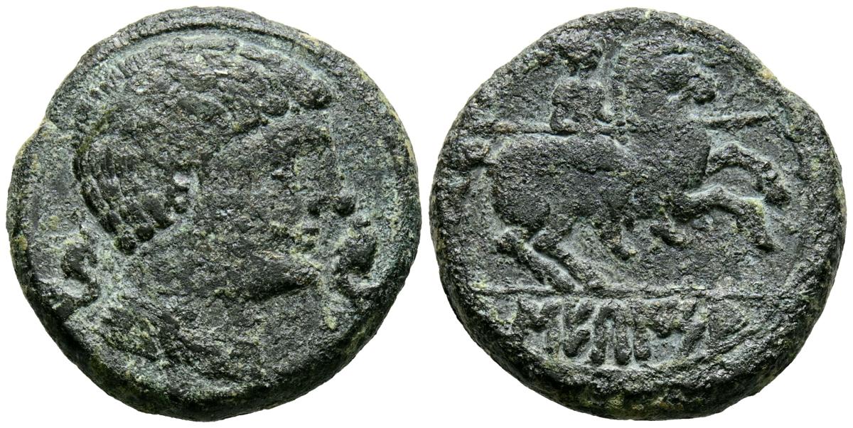 SECAISA (Segeda, Zaragoza). As. (Ae. 10,79g/23mm). 120-20 a.C. (FAB-2131). Anv: Cabeza masculina a derecha, entre dos delfines. Rev: Jinete con lanza a derecha, debajo leyenda ibérica: SECaISA. MBC-.