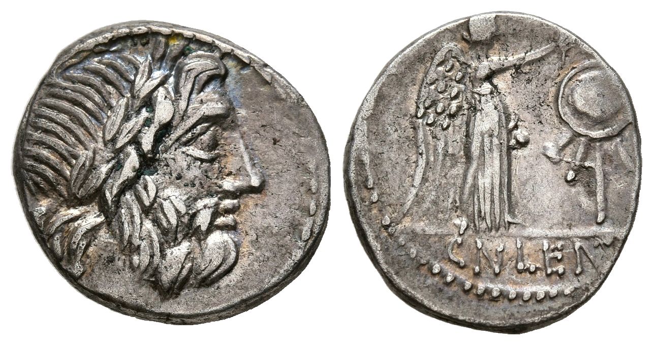 GENS CORNELIA. Quinario. (Ar. 1,96g/14mm). 88 a.C. Roma. (RIC 345/2). Anv: Cabeza laureada de Júpiter a derecha. Rev: Victoria estante coronando escudo a derecha, debajo leyenda: CN LENT. EBC-.