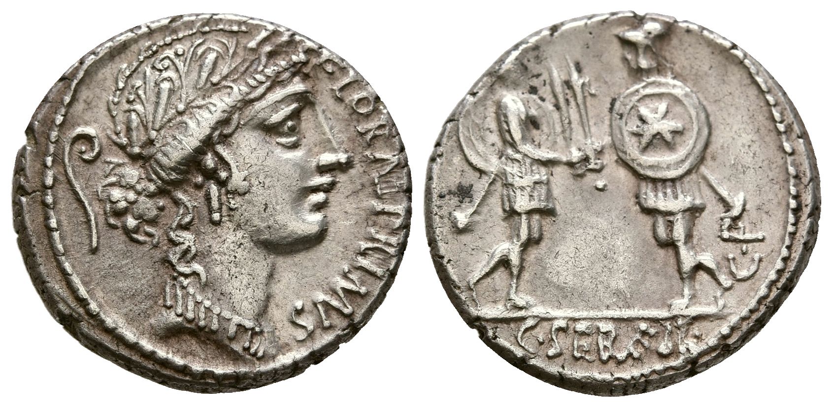 GENS SERVILIA. Denario. (Ar. 4,00g/18mm). 57 a.C. Roma. (Crawford 423/1; FFC 1122). Anv: Cabeza laureada de Flora a derecha, detrás lituo, alrededor leyenda: FLORAL PRIMVS. Rev: Dos guerreros enfrentados con lanzas y escudos, en campo: CF, en exergo: C SERVEIL. EBC-. Escaso ejemplar asÃ.
