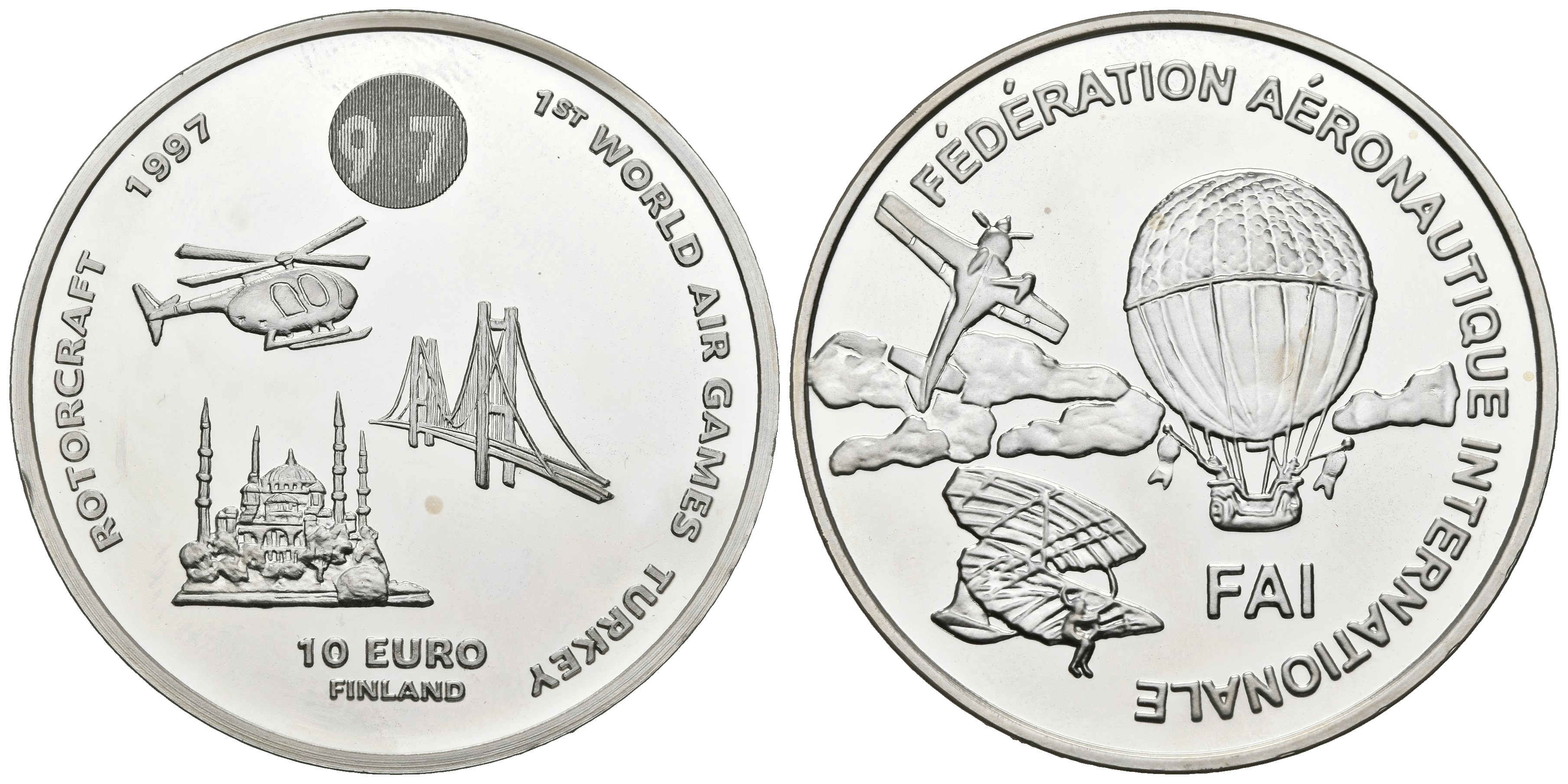 FINLANDIA. 10 Euro. 1st World Air Games Turkey. Motorcraft. 1997. (Ar. 27,39g/38,5mm). Proof.