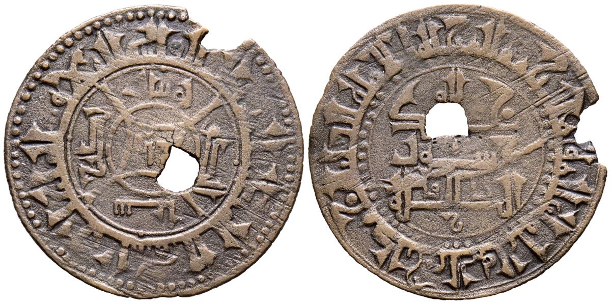 QARAJANÍES. GRANDES JANES. MUHAMMAD B. 'ALI (393-415/1002-1024). Felús. (Ae. 2,53g/27mm). 404 H. Ilaq. (Zenón-53284). MBC. Perforación y rotura al borde.