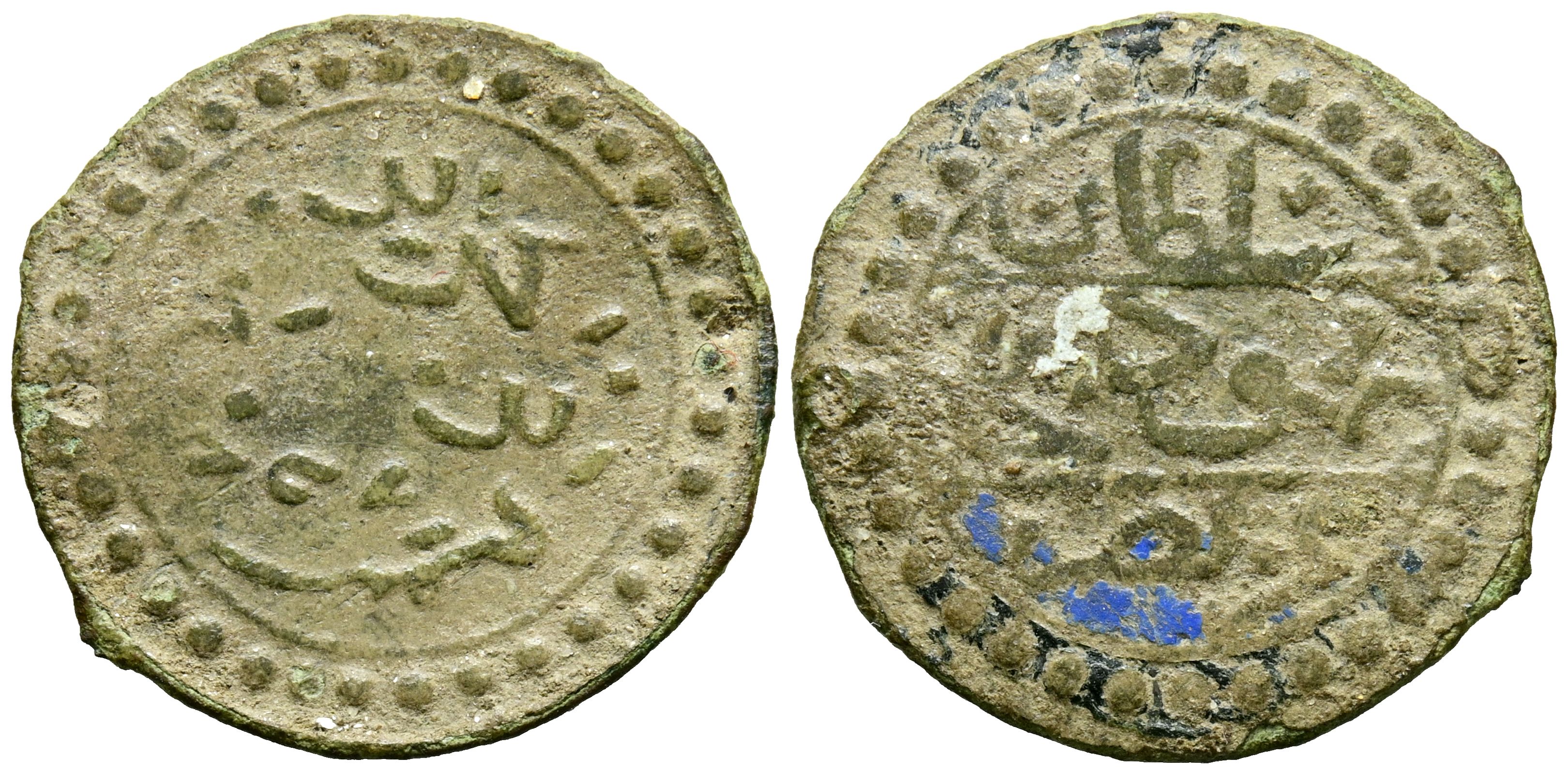 OTOMANO. Amuleto monetiforme. (Ae. 2,05g/23mm). Anv: Leyenda en tres lÃneas con resto de esmaltado en tonos; blanco, azul y negro. Rev: Leyenda pseudo-epigráfica. MBC.