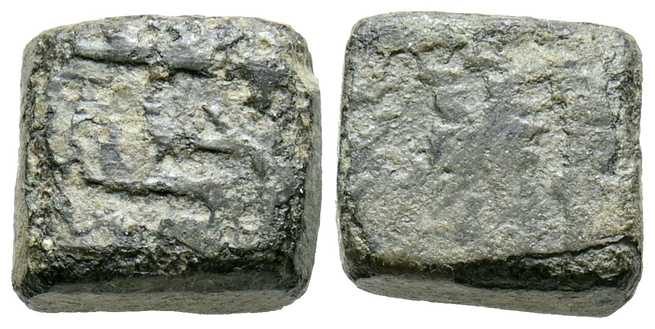 Ponderal de 1/2 Dinar, Anónimo. (Ae. 1,78g/9x8x4mm). Sin fecha. Forma cuadrada con epigrafía cúfica. (Tonegawa Tipo-¿D82?). MBC+. Raro.