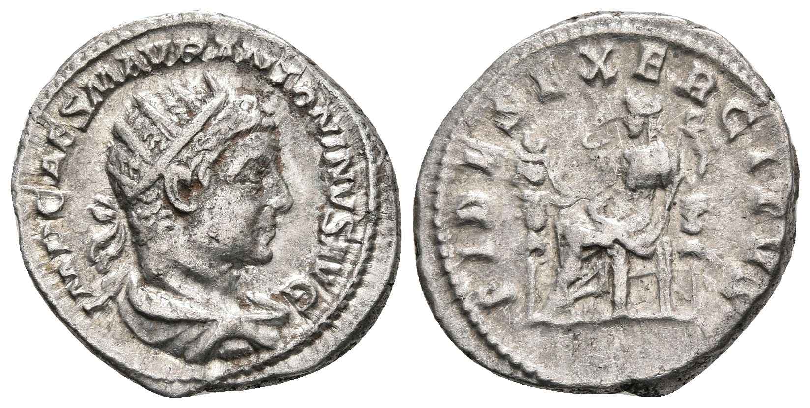 HELIOGABALO. Antoniniano. 218-219 d.C. Roma. A/ Busto radiado y drapeado con coraza a derecha. IMP CAES M AVR ANTONINVS AVG. R/ Fides sedente entre estandartes, en mano izquierda antorcha y en la derecha águila. FIDES EXERCITVS. RIC 70. Ar. 5,72g. MBC+/MBC.
