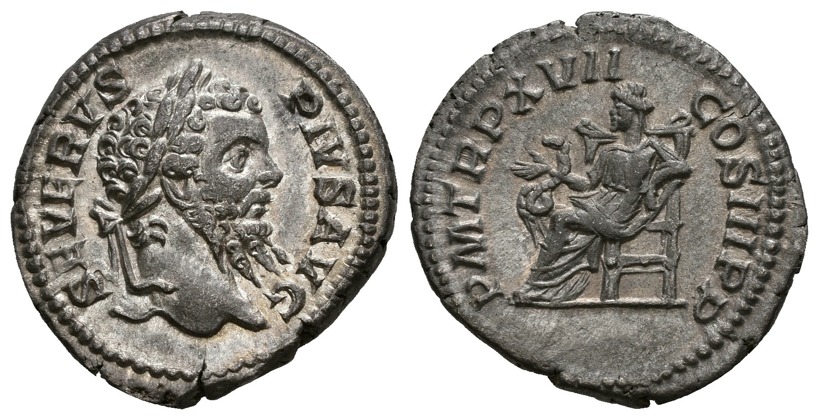 SEPTIMIO SEVERO. Denario. (Ar. 2,73g/20mm). 210 d.C. Roma. (RIC 236). Anv: Cabeza laureada de Septimio Severo a derecha, alrededor leyenda: SEVERVS PIVS AVG. Rev: Salus sentada a izquierda alimentando a serpiente, alrededor leyenda: P M TR P XVII COS III P P. EBC. Restos de brillo original.