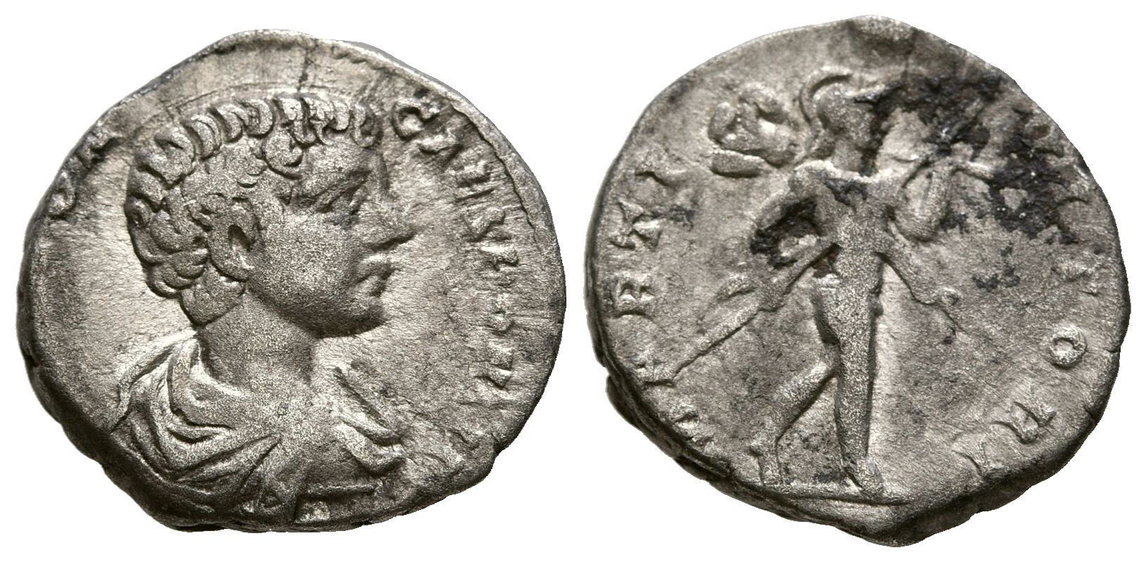 CARACALLA. Denario. (Ar. 3,07g/17mm). 198 d.C. Roma. (RIC 11). Anv: Busto drapeado de Caracalla a derecha, alrededor leyenda: M AVR ANTON CAES PONTIF. Rev: Marte avanzando a derecha portando lanza y escudo, alrededor leyenda: MARTI VLTORI. MBC-.
