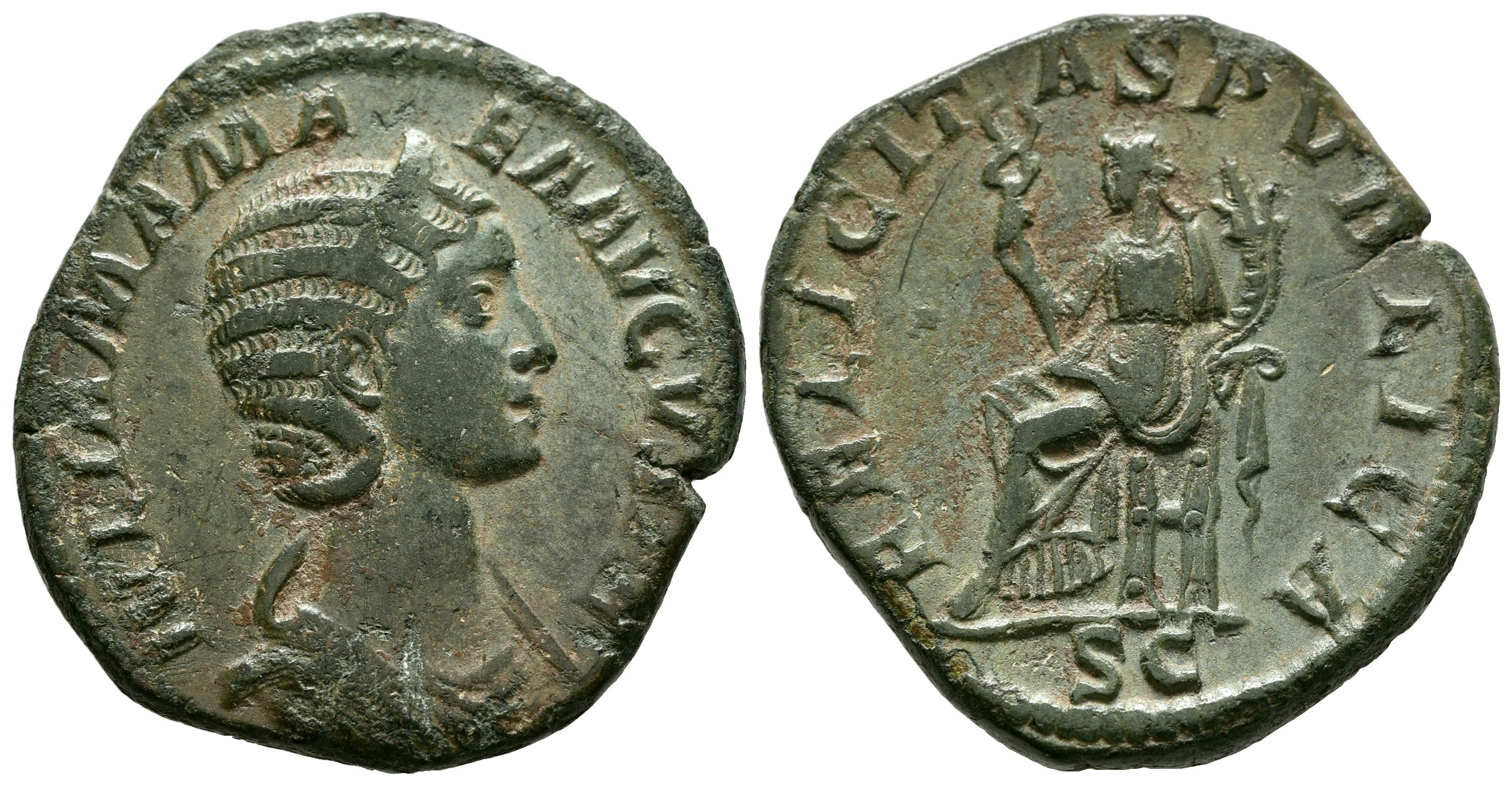 JULIA MAMAEA. Sestercio. (Ae. 18,26g/30mm). 230 d.C. Roma. (RIC 679). Anv: Busto diademado y drapeado de Julia Mamaea a derecha, alrededor leyenda: IVLIA MAMAEA AVGVSTA. Rev: Felicitas sentada a izquierda portando caduceo y cornucopia, en exergo: SC, alrededor leyenda: FELICITAS PVBLICA. MBC+.