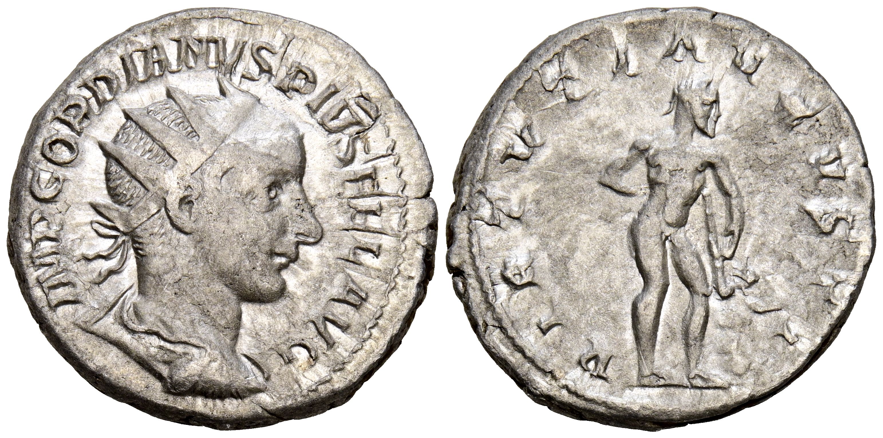 GORDIANO III. Antoniniano. (Ar. 5,55g/22mm). 241-243 d.C. Roma. (RIC 95). Anv: Busto radiado y drapeado de Gordiano III a derecha, alrededor leyenda: IMP GORDIANVS PIVS FEL AVG. Rev: Hércules estante a izquierda apoyado sobre mazo, alrededor leyenda: VIRTVTI AVGVSTI. MBC.