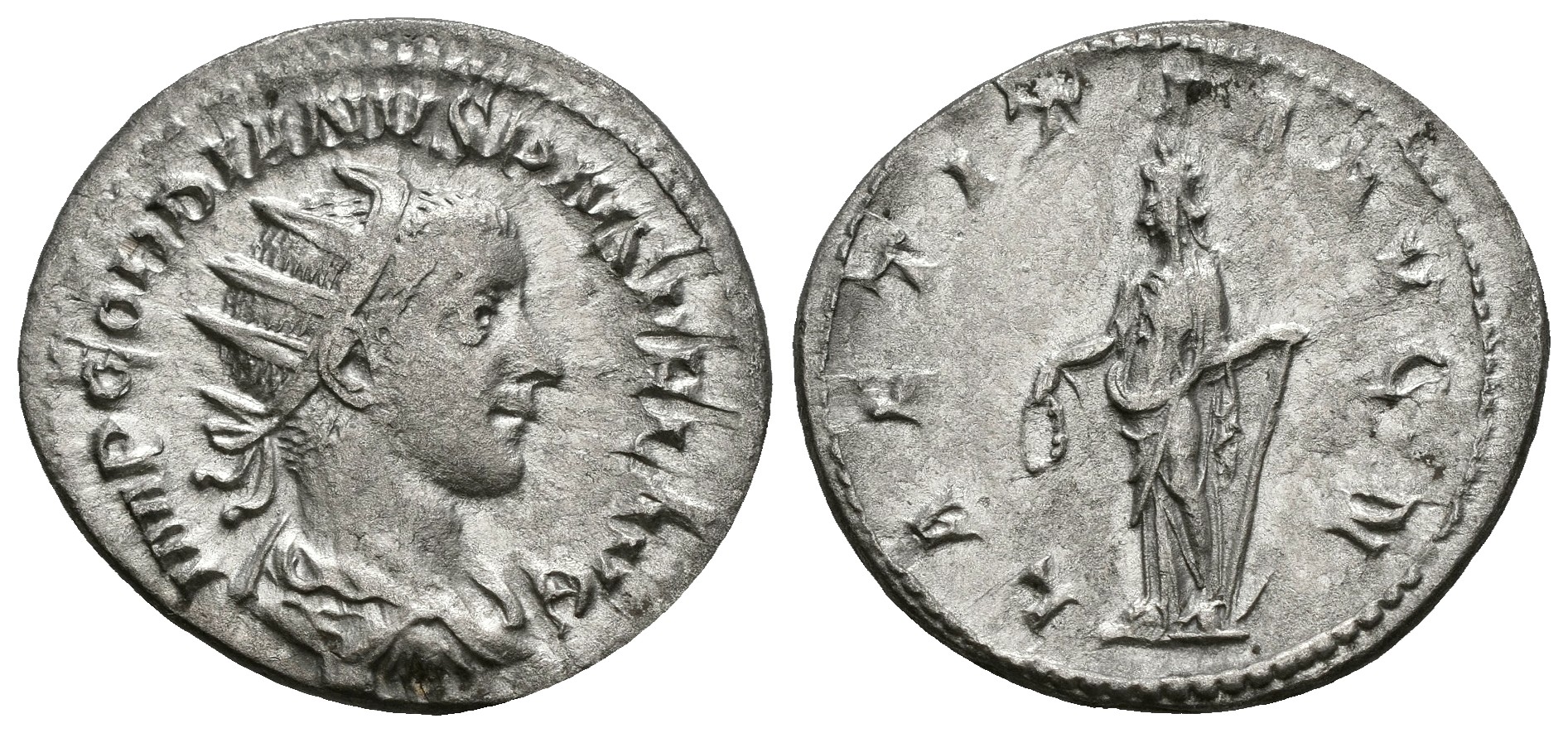 GORDIANO III. Antoniniano. (Ar. 4,02g/23mm). 241-243 d.C. Roma. (RIC 86). Anv: Busto drapeado y radiado a derecha, alrededor leyenda: IMP GORDIANVS PIVS FEL AVG. Rev: Laetitia estante a izquierda portando patera y timón, alrededor leyenda: LAETITIA AVG N. MBC+.