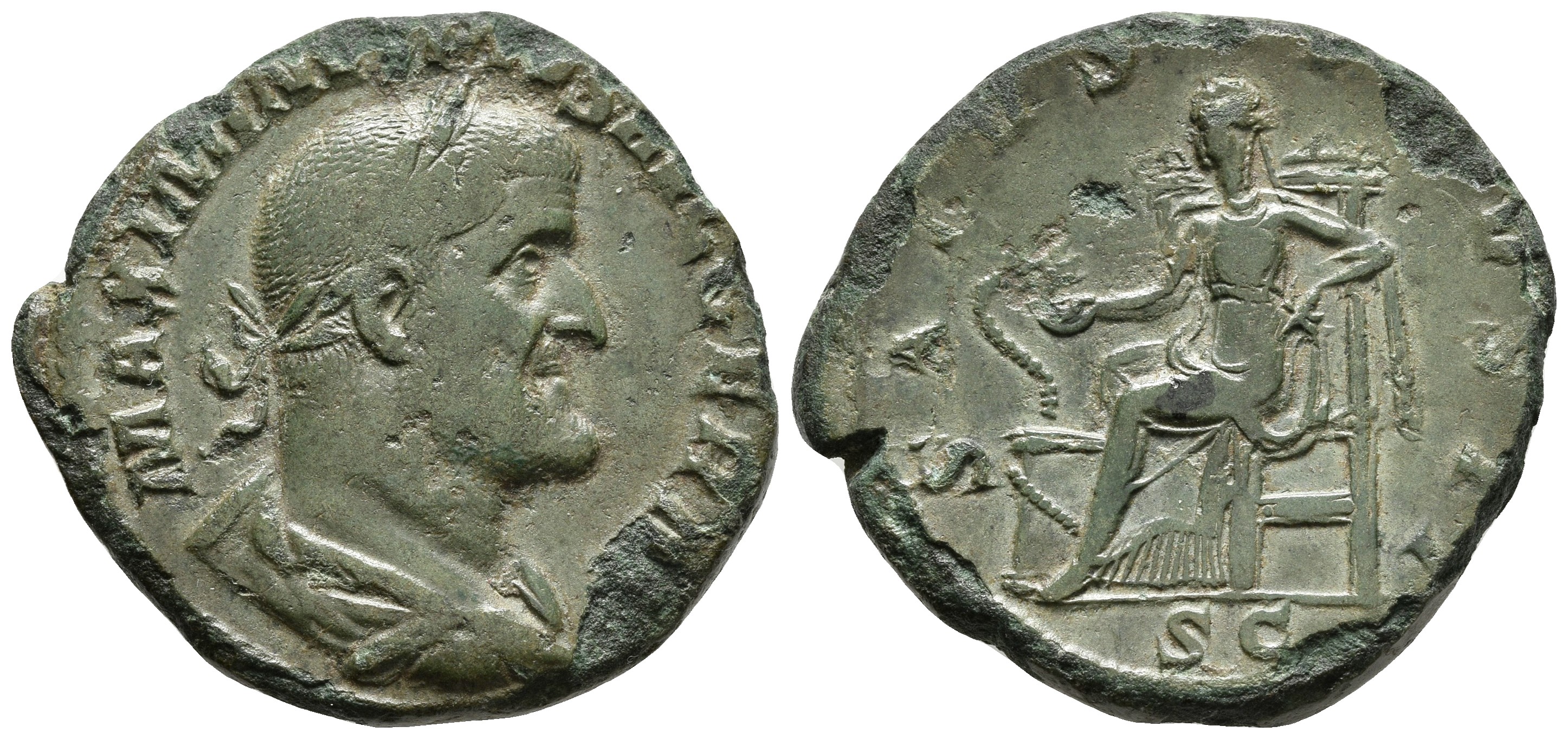 MAXIMINO. Sestercio. 236-237 d.C. Roma. A/ Busto laureado y drapeado con coraza a derecha. MAXIMINVS PIVS AVG GERM. R/ Salus estante a izquierda alimentando serpiente enroscada en altar. RIC 85; BMC 175. Ae. 15,84g. MBC+.