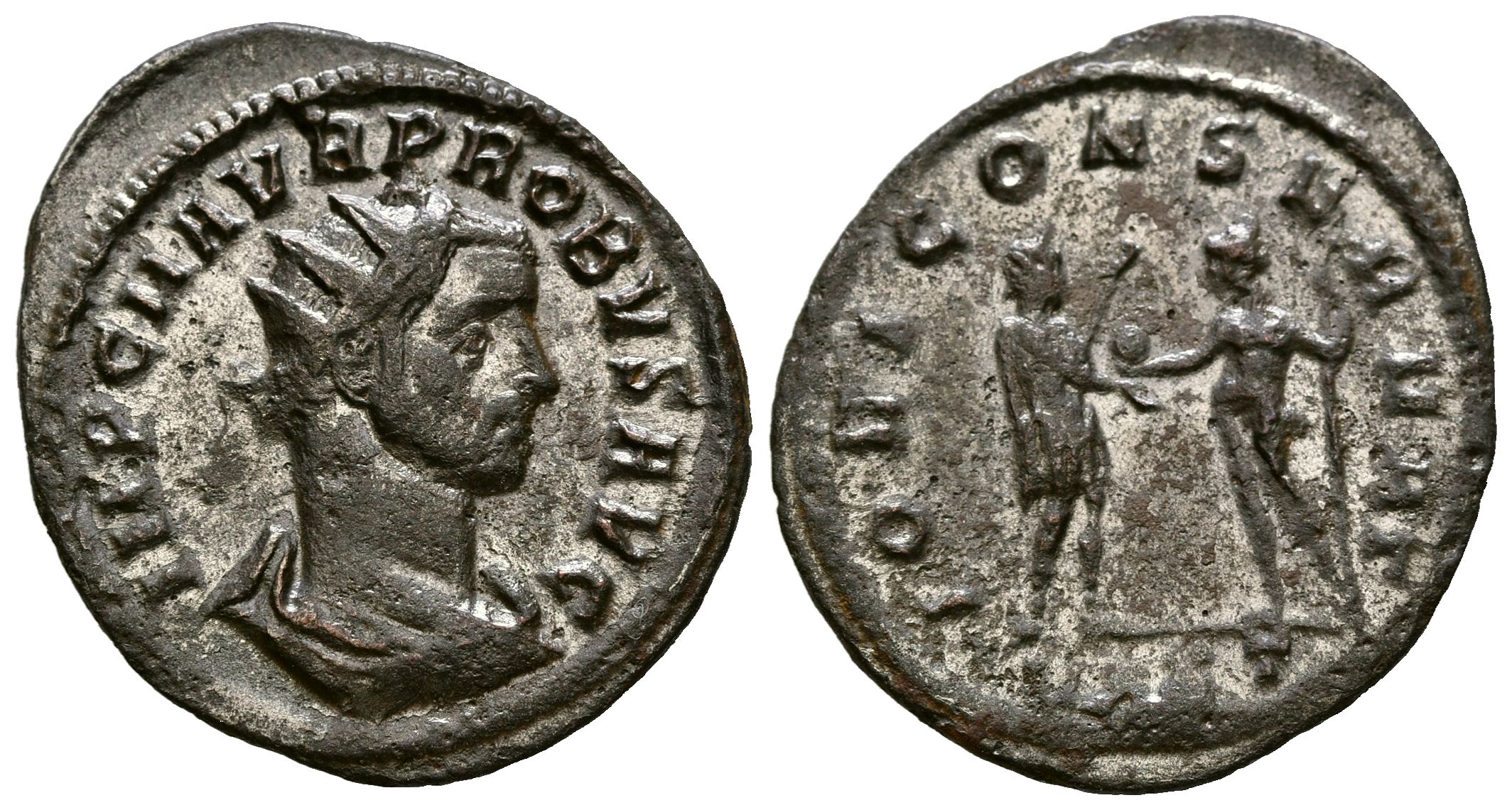 PROBO. Antoniniano. (Ae. 3,30g/25mm). 276 d.C. Ticinum. (RIC 386). Anv: Busto radiado y drapeado de Probo a derecha, alrededor leyenda: IMP C M AVR PROBVS AVG. Rev: Probo estante a derecha portando estandarte con águila y recibiendo globo de Júpiter estante a izquierda portando lanza, en exergo: VXXT, alrededor leyenda: IOVI CONSERVAT. MBC/MBC-. Restos de plateado original.