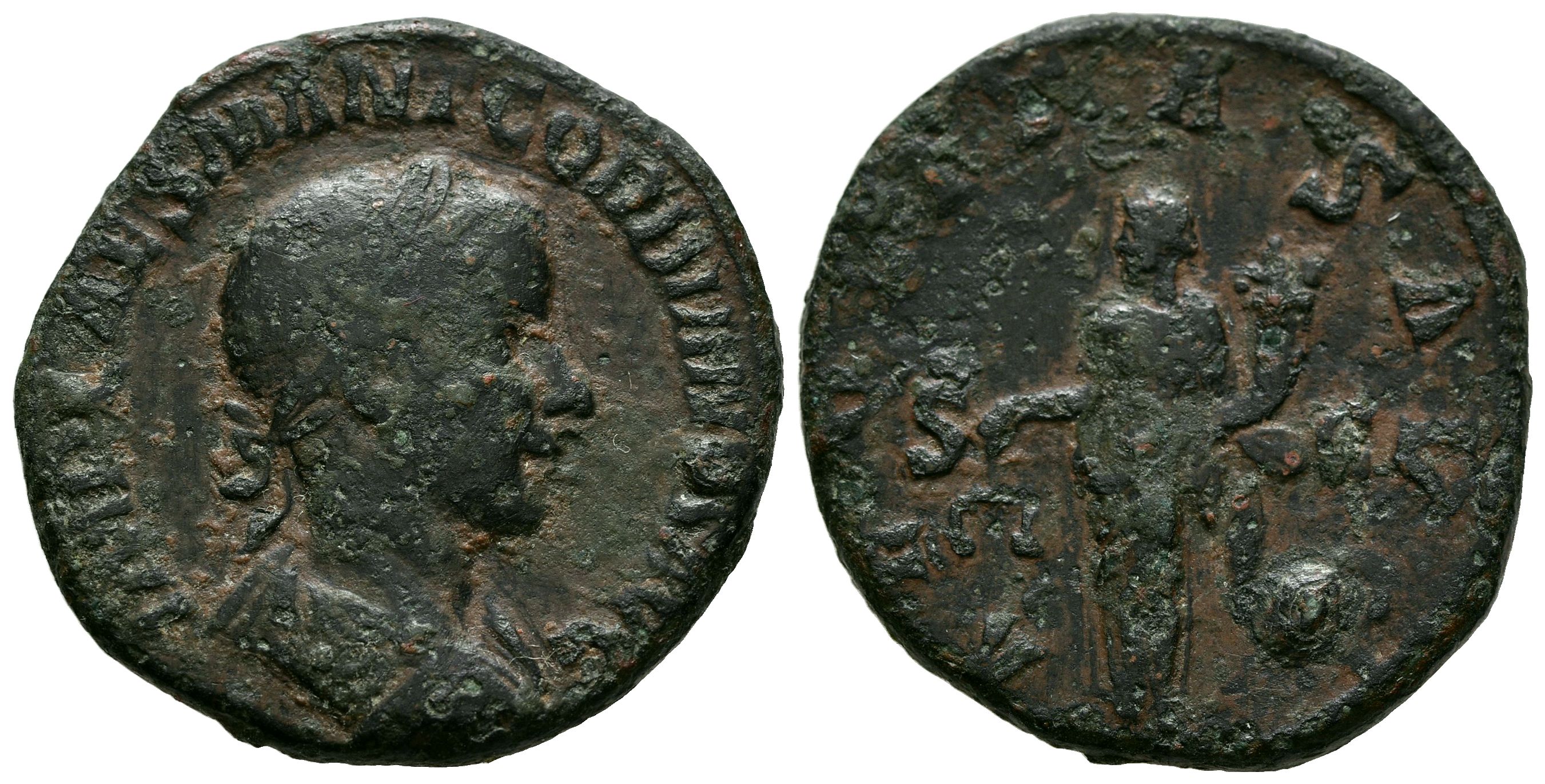 GORDIANO III. As. (Ae. 13,98g/29mm). 239 d.C. Roma. (RIC 267a). Anv: Busto laureado y drapeado de Gordiano III a derecha, alrededor leyenda: IMP CAES M ANT GORDIANVS AVG. Rev: Aequitas estante a izquierda portando escalas y cornucopia, entre: S-C, alrdedor leyenda: AEQVITAS AVG. MBC-.