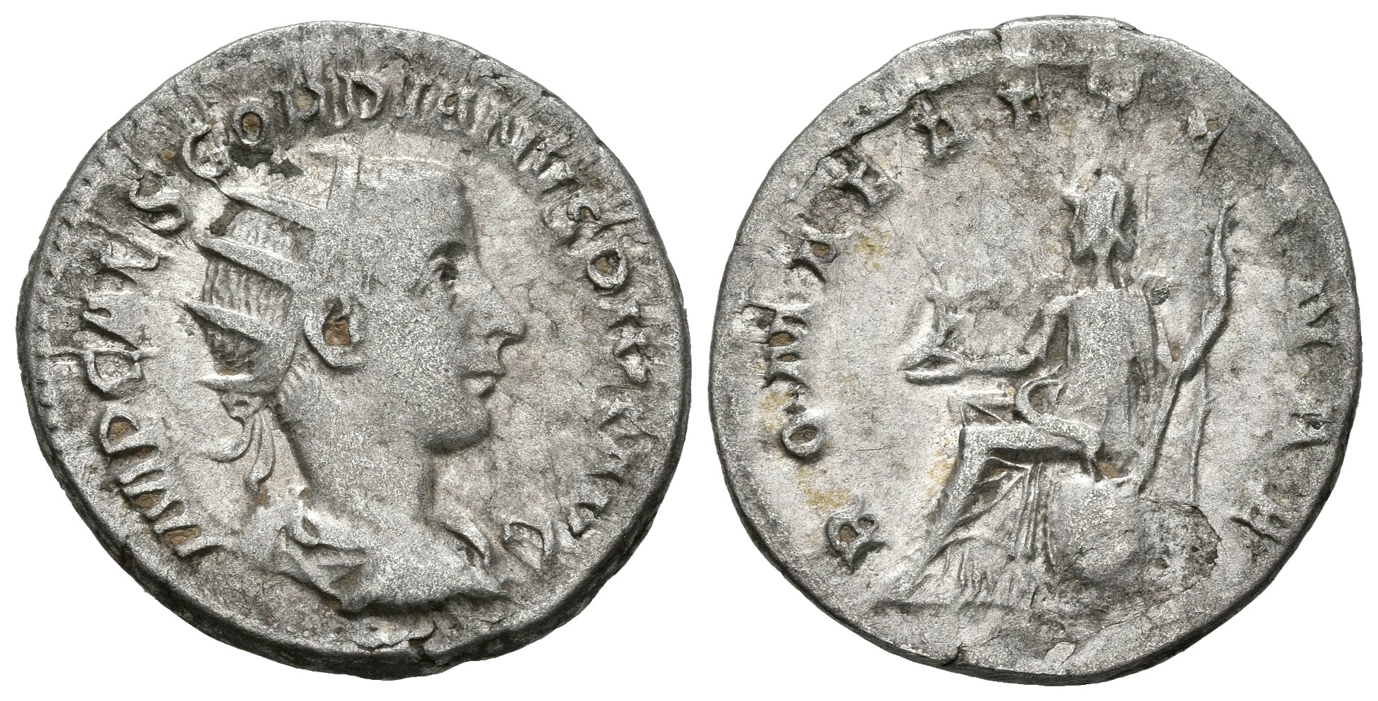 GORDIANO III. Antoniniano. 239 d.C. Roma. A/ Busto radiado, drapeado y con coraza a derecha. IMP CAES GORDIANVS PIVS AVG. R/ Roma sedente a izquierda portando lanza y Victoria. ROMAE AETERNAE. RIC 38. Ar. 3,74g. MBC-.