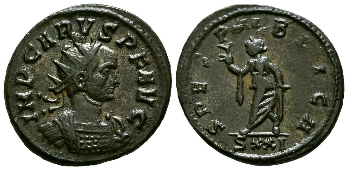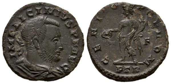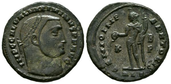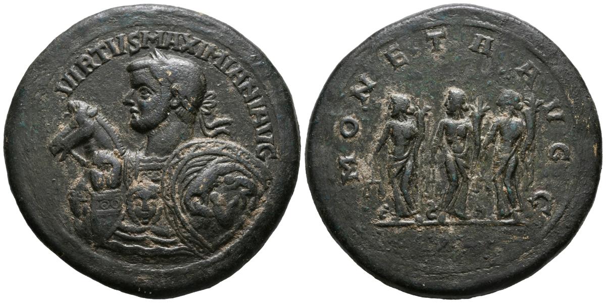 MAXIMIANO, Hércules. Medallón. (Ae. 40,99g/41mm). 297-298 d.C. Roma. Anv: VIRTVS MAXIMIANI AVG. Busto laureado con coraza con Aegis de Maximiano a derecha portando escudo decorado por loba amamantando a Rómulo y Remo, detrás cabeza de caballo. Rev: MONETA AVGG. Las tres Moneta estantes de frente mirando a izquierda, las tres portando escalas y cornucopias. (Cohen 405; BMC Medallions 4; Gnecchi 18). MBC+. Campo del anverso repasado. Muy raro.