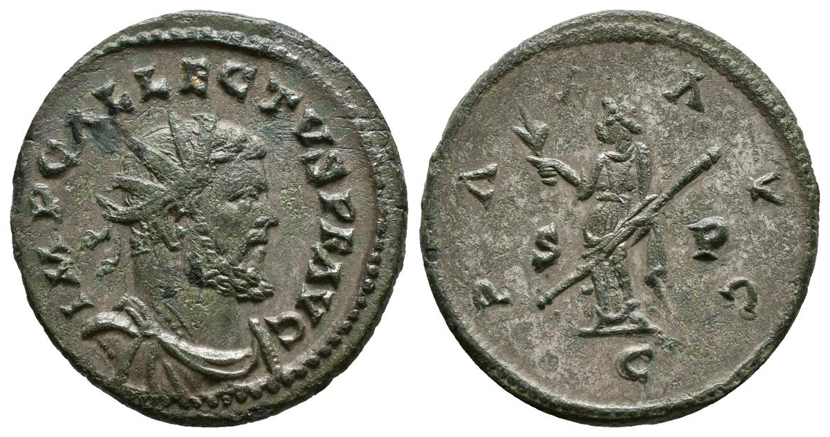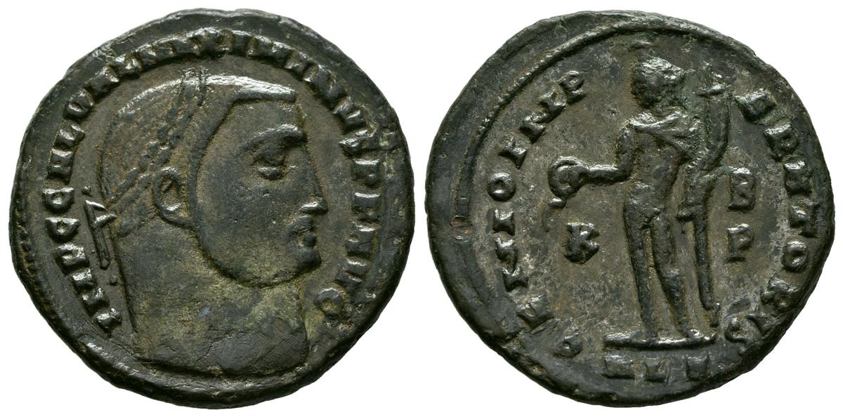 De la misma manera que Diocleciano lo hizo con Júpiter, Maximiano aparece identificado con Hércules en un magnífico retrato de gran fuerza y realismo. La íntima asociación de la persona del gobernante con la naturaleza divina del héroe se inserta en el programa de propaganda imperial, que encontraba en la moneda y medallas una de sus mejores vías de difusión. No falta en esta medalla otro detalle de gran peso simbólico: la representación de Roma y su fundación en las imágenes de la loba, Rómulo y Remo. En el reverso, y con la representación de la diosa Moneta, encontramos otra escena de potente carga simbólica; parece ser que el culto a esta diosa se estableció debido a la influencia de la religión griega y que ésta era la equivalente al culto griego de Mnemosyne. La alegoría del reverso de este medallón entronca, pues, con los mismísimos orígenes de la civilización romana. No es la única referencia a la cultura griega presente en este medallón. De vuelta al anverso podemos observar en el centro de la coraza la mitológica figura de la medusa, probablemente la villana más reconocida de toda la mitología griega, capaz de petrificar a cualquier ser vivo con su simple mirada.