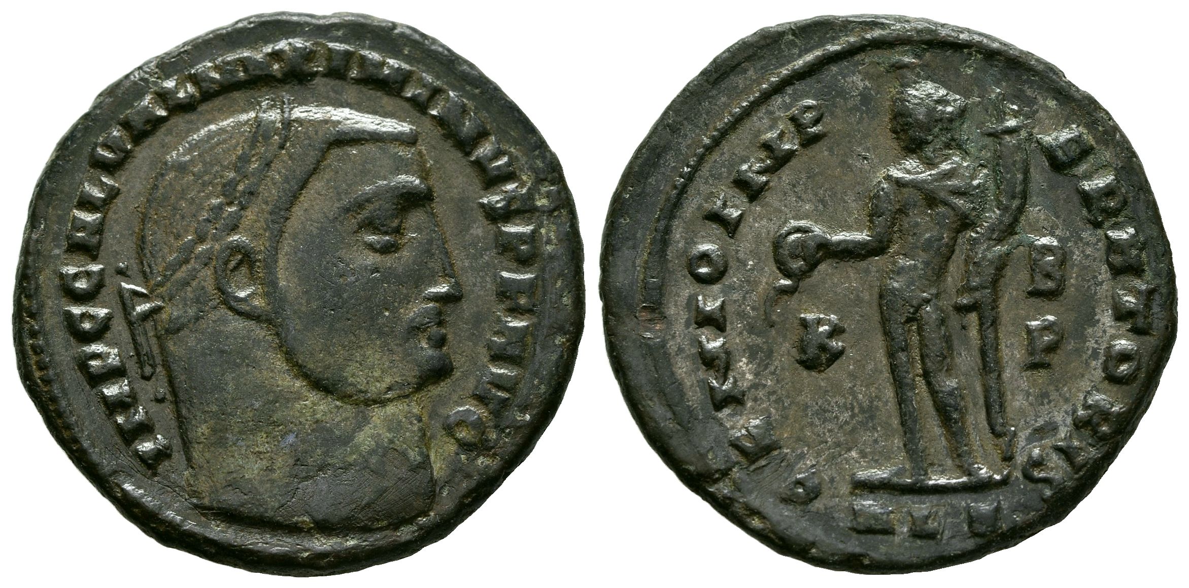 MAXIMINO II. Follis. (Ae. 7,12g/25mm). 308-310 d.C. AlejandrÃa. (RIC 107). Anv: Cabeza laureada de Maximino II a derecha, alrededor leyenda: IMP C GAL VAL MAXIMINVS P F AVG. Rev: Genio estante a izquierda portando patera y cornucopia, en campo: B/K-P, en exergo: ALE, alrededor leyenda: GENIO IMPERATORIS. MBC.