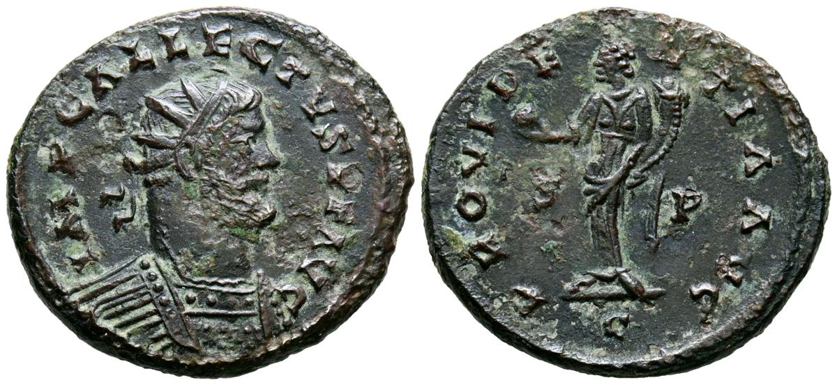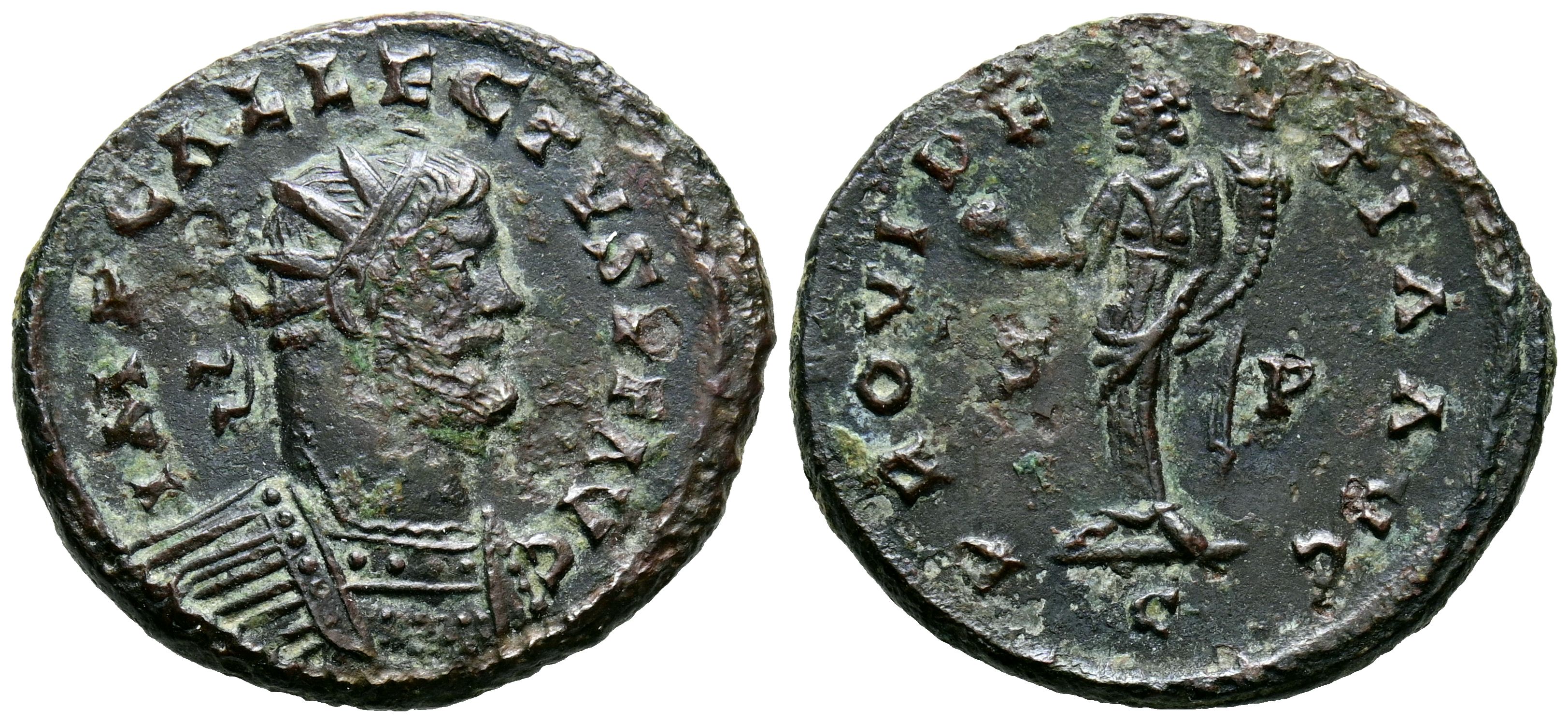 ALECTO. Antoniniano. (Ae. 4,30g/23mm). 293-296 d.C. Camulodunum. (RIC 108). Anv: Busto radiado y con coraza de Alecto a derecha, alrededor leyenda: IMP C ALLECTVS P F AVG. Rev: Providentia estante a izquierda portando globo y cornucopia, entre: S-P, en exergo: C, alrdedor leyenda: PROVIDENTIA AVG. MBC+.