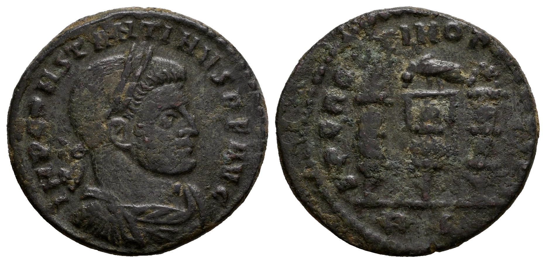 CONSTANTINO I. Follis. 312-313 d.C. Roma. A/ Busto laureado y con coraza a izquierda. IMP CONSTANTINVS P F AVG. R/ Aguila estante a izquierda entre dos vexillum. RIC 350a. Ae. 4,10g. MBC+/MBC.