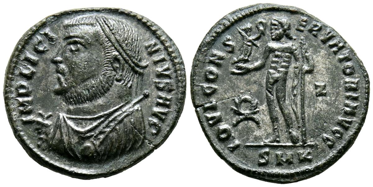 LICINIO I. Follis. (Ae. 3,09g/20mm). 317-320 d.C. CÃcico. (RIC 9). Anv: Busto laureado y con coraza de Licinio I a izquierda portando cetro y mappa, alrededor leyenda: IMP LICINIVS AVG. Rev: Júpiter estante a izquierda portando cetro y Victoria con corona de laurel, entre corona de laurel y Z, en exergo: SMK, alrededor leyenda: IOVI CONSERVATORI AVGG. EBC+.