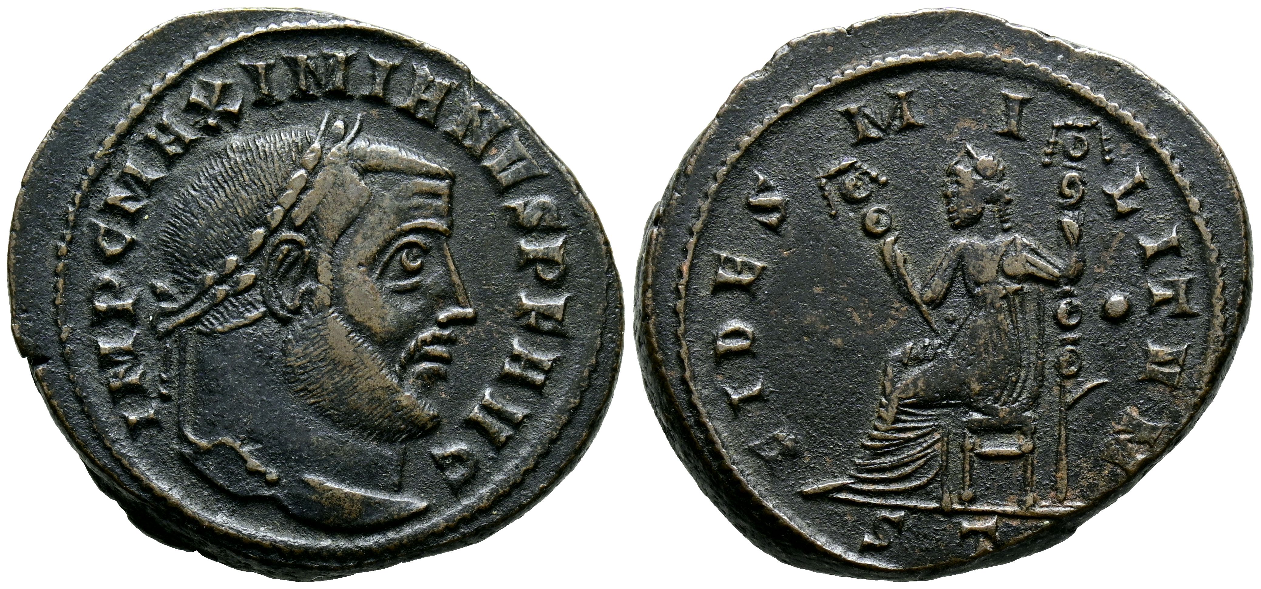 MAXIMIANO HERCULEO. Follis. (Ae. 9,84g/30mm). 305 d.C. Ticinum. (RIC 55b). Anv: Cabeza laureada de Maximiano a derecha, alrededor leyenda: IMP C MAXIMIANVS PF AVG. Rev: Fides sentada a izquierda portando dos estandartes, en exergo: ST, alrededor leyenda: FIDES MILITVM. MBC+.