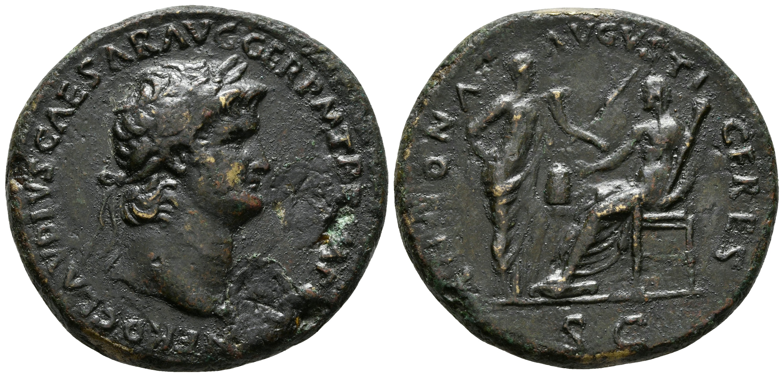 NERON. Sestercio. 65 d.C. Lugdunum. A/ Busto laureado a derecha. NERO CLAVD CAESAR AVG GER P M TR P IMP P P. R/ Ceres sedente a izquierda con mazorcas de maiz y antorcha, Annona estante frente a ella sosteniendo corpucopia, entre ambas modio en un altar con guirnaldas y detrás popa de barco, en exergo SC. RIC 390; BMCRE 305. Ae. 23,31g. MBC/MBC+.
