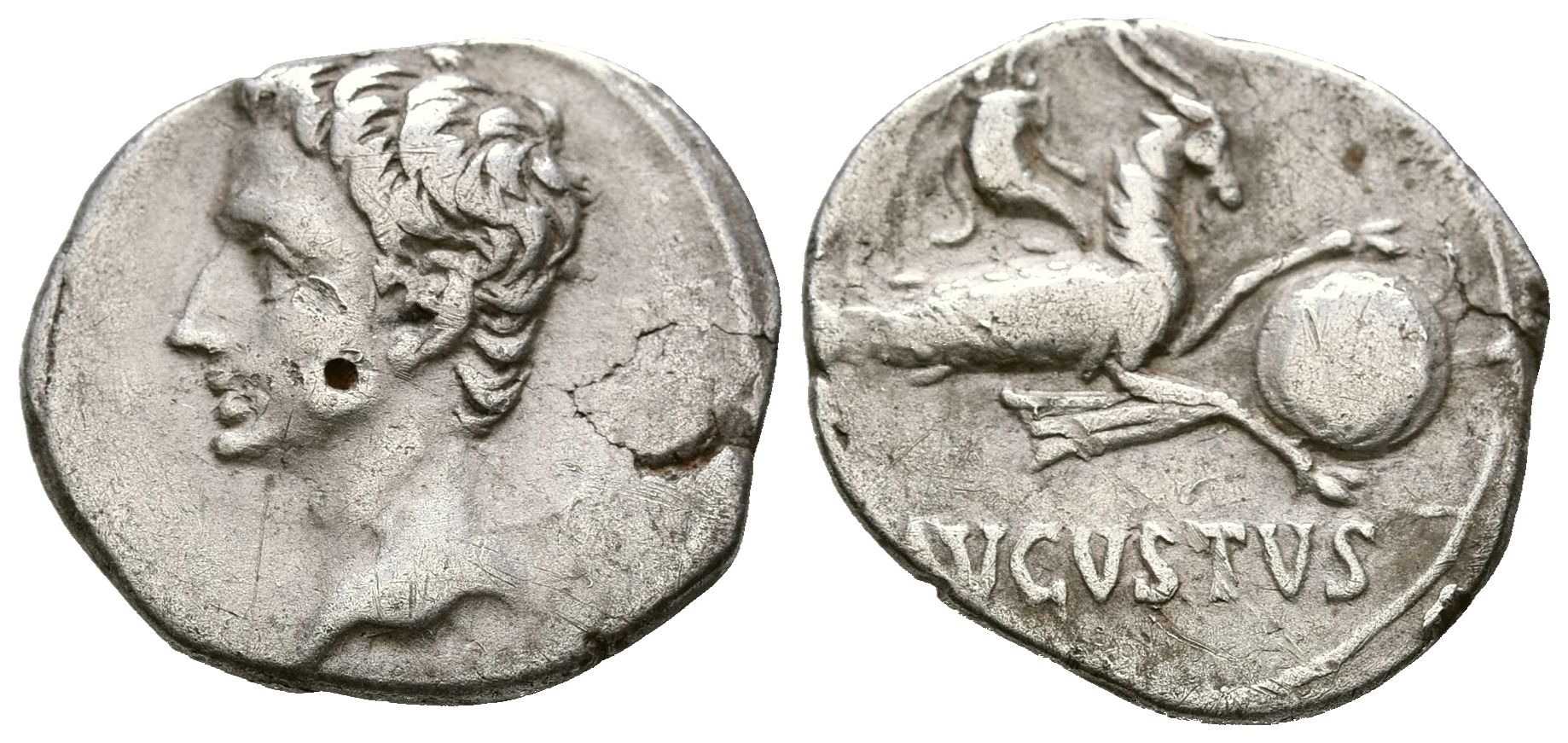AUGUSTO. Denario. (Ar. 3,73g/20mm). 17-16 a.C. Colonia Patricia. (RIC 130). Anv: Cabeza de Augusto a izquierda. Rev: Capricornio a derecha con globo y timón, encima cornucopia. MBC+/MBC. Escaso.