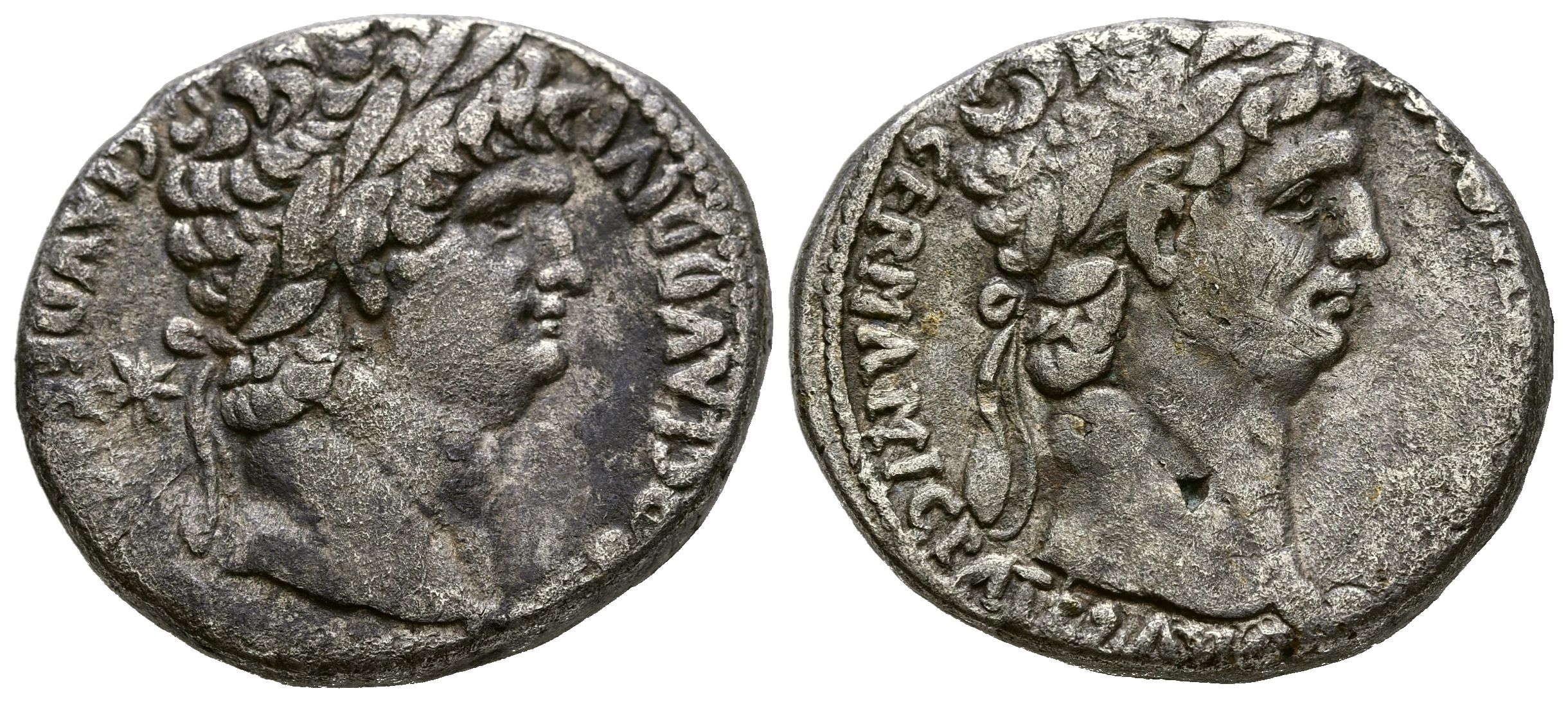 NERON y DIVO CLAUDIO I. Tetradracma. (Ar. 13,65g/26mm). 63-68 d.C. Antioquía. (Seaby 4123). Anv: Cabeza laureada de Nerón a derecha, detrás estrella, alrededor leyenda griega. Rev: Cabeza laureada de Claudio I a derecha, alrededor leyenda griega. MBC. Muy escaso ejemplar.