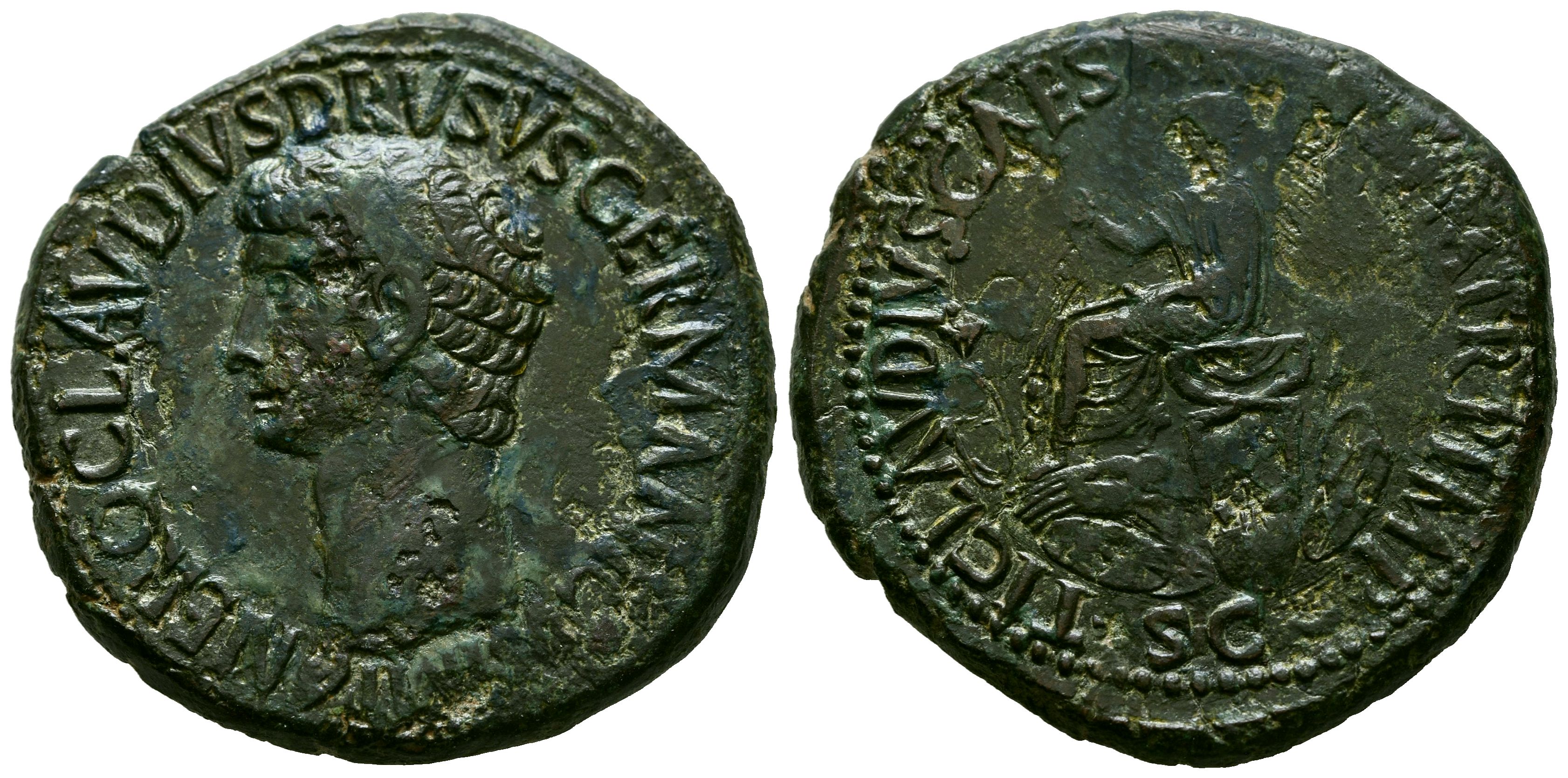 NERO DRUSO, en época de Claudio I. Sestercio. (Ae. 25,81g/36mm). 41-50 d.C. (RIC 93). Anv: Cabeza de Claudio I a izquierda, alrededor leyenda: NERO CLAVDIVS DRVSVS GERMANICVS IMP. Rev: Claudio I sentado a izquierda sobre silla curul portando rama, debajo armas, alrededor leyenda: TI CLAVDIVS CAESAR AVG P M TR P IMP. MBC. Raro ejemplar.